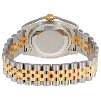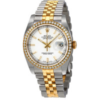 Stainless steel case with a stainless steel Rolex jubilee bracelet with 18kt yellow gold center links. Fixed 18kt yellow gold diamond-set bezel. White dial with yellow gold-tone hands and index hour markers. Minute markers around the outer rim. Dial Type: Analog. Luminescent hands and markers. Date display at the 3 o'clock position. Rolex calibre 3135 automatic movement with a 50-hour power reserve. Scratch resistant sapphire crystal. Screw down crown. Solid case back. Case size: 36 mm. Round case shape. Concealed crown clasp. Water resistant at 100 meters / 330 feet. Functions: date, hour, minute, second, chronometer. Casual watch style. Watch label: Swiss Made. Rolex Oyster Perpetual Datejust 36 White Dial Stainless Steel and 18K Yellow Gold Jubilee Bracelet Automatic Ladies Watch 116243WSJ. GENERAL Color: Gold / White / Yellow INFORMATION Brand: Rolex Series: Oyster Perpetual Collection Name: Oyster Perpetual Gender: Womens Model: 116243WSJ Watch Label: Swiss Made Movement: Automatic Engine: Rolex Calibre 3135 Power Reserve: 50 hours CASE Case Size: 36 mm Case Color: Silver-Tone Case Material: Stainless Steel Case Shape: Round Case Back: Solid BAND Band Material: Stainless Steel and 18kt Yellow Gold Rolex Jubilee Band Type: Bracelet Band Color: Silver-tone Clasp: Concealed Crown DIAL Dial Color: White Type: Analog Crystal: Scratch Resistant Sapphire Hands: Yellow Gold-tone Dial Markers: Index Second Markers: Minute Markers around the outer rim Luminiscence: Hands and Markers Bezel: Fixed Bezel Color: 18kt Yellow Gold Bezel Material: Diamond Set Crown: Screw Down FEATURES Water Resistance: 100 meters / 330 feet Calendar: Date display at the 3 o'clock position Functions: Date, Hour, Minute, Second, Chronometer Watch Features: Analog, Chronometer, Perpetual, Gold, Stainless Steel, Diamond ADDITIONAL INFO Watch Style: Casual Warranty: 2 Year Jomashop Warranty UPC Code: 845960075565 Jomashop Sku: RLX116243WSJ Department: Watches Category: Watches