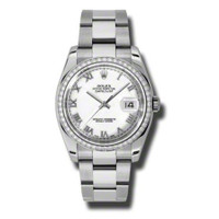 Stainless steel case with a stainless steel rolex oyster bracelet. Fixed - 18k white gold diamond-set bezel. White dial with silver-tone hands and Roman numeral hour markers. Dial Type: Analog. Date display at the 3 o'clock position. Automatic movement. Scratch resistant sapphire crystal. Screw down crown. Case diameter: 36 mm. Round case shape. Oysterclasp clasp. Water resistant at 100 meters / 330 feet. Functions: date, hour, minute, second. Luxury watch style. Watch label: Swiss Made. Rolex Oyster Perpetual Datejust 36 White Dial Stainless Steel Rolex Oyster Automatic Ladies Watch 116244WRO. GENERAL Color: White INFORMATION Brand: Rolex Series: Oyster Perpetual Collection Name: Oyster Perpetual Gender: Womens Model: 116244WRO Watch Label: Swiss Made Movement: Automatic Engine: Rolex Calibre 3135 Power Reserve: 50 hours CASE Case Size: 36 mm Case Color: Silver-Tone Case Material: Stainless Steel Case Shape: Round Case Back: Solid BAND Band Material: Stainless Steel Rolex Oyster Band Type: Bracelet Band Color: Silver-tone Clasp: Oysterlock DIAL Dial Color: White Type: Analog Crystal: Scratch Resistant Sapphire Hands: Silver-tone Dial Markers: Roman Numeral Second Markers: Minute Markers around the outer rim Bezel: Fixed Bezel Color: 18kt White Gold Bezel Material: Diamond Set Crown: Screw Down FEATURES Water Resistance: 100 meters / 330 feet Calendar: Date display at the 3 o'clock position Functions: Date, Hour, Minute, Second, Chronometer Watch Features: Analog, Chronometer, Perpetual, Gold, Stainless Steel, Diamond ADDITIONAL INFO Watch Style: Luxury Warranty: 2 Year Jomashop Warranty UPC Code: 845960075923 Jomashop Sku: RLX116244WRO Department: Watches Category: Watches