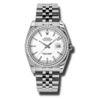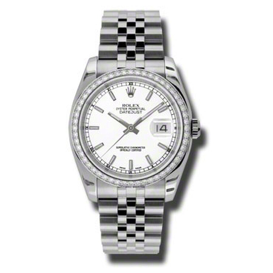 Stainless steel case with a stainless steel rolex jubilee bracelet. Fixed - 18k white gold diamond-set bezel. White dial with silver-tone hands and stick hour markers. Dial Type: Analog. Date display at the 3 o'clock position. Automatic movement. Scratch resistant sapphire crystal. Case diameter: 36 mm. Round case shape. Water resistant at 100 meters / 330 feet. Functions: date, hour, minute, second. Luxury watch style. Watch label: Swiss Made. Rolex Oyster Perpetual Datejust 36 White Dial Stainless Steel Rolex Jubilee Automatic Men's Watch 116244WSJ. GENERAL Color: Gold / White CASE Case Size: 36 Case Color: Silver-Tone Case Material: Stainless Steel Case Shape: Round Case Back: Solid BAND Band Material: Stainless Steel Rolex Jubilee Band Type: Bracelet Band Color: Silver-tone DIAL Dial Color: White Type: Analog Crystal: Scratch Resistant Sapphire Hands: Silver-tone Dial Markers: Stick Second Markers: Minute Markers around the outer rim Bezel: Fixed Bezel Color: 18kt White Gold Bezel Material: Diamond Set Crown: Screw Down INFORMATION Brand: Rolex Series: Oyster Perpetual Collection Name: Oyster Perpetual Gender: Mens Model: 116244WSJ Watch Label: Swiss Made Movement: Automatic Engine: Rolex Calibre 3135 Power Reserve: 50 hours FEATURES Water Resistance: 100 meters / 330 feet Calendar: Date display at the 3 o'clock position Functions: Date, Hour, Minute, Second, Chronometer Watch Features: Analog, Chronometer, Perpetual, Gold, Stainless Steel, Diamond ADDITIONAL INFO Watch Style: Luxury Warranty: 2 Year Jomashop Warranty UPC Code: 845960075930 Jomashop Sku: RLX116244WSJ Department: Watches Category: Watches