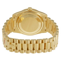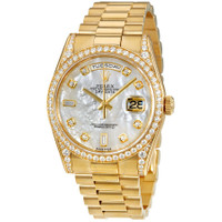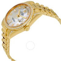 18k yellow gold case with a 18k yellow gold Rolex President bracelet. Fixed 18k yellow gold, diamond-set bezel. Mother of pearl dial with yellow gold-tone hands and diamond hour markers. Dial Type: Analog. Date display at the 3 o'clock position. Automatic movement. Scratch resistant sapphire crystal. Screw down crown. Case size: 36 mm. Round case shape. Concealed crown clasp. Water resistant at 100 meters / 330 feet. Functions: date, hour, minute, second. Luxury watch style. Watch label: Swiss Made. Rolex Oyster Perpetual Mother of Pearl Diamond 18K Yellow Gold Ladies Watch 118388MDP. INFORMATION Brand: Rolex Series: Day-Date Collection Name: Day-Date Gender: Womens Model: 118388MDP Watch Label: Swiss Made Movement: Automatic Engine: Rolex Calibre 3155 Power Reserve: 48 hours CASE Case Size: 36 mm Case Material: 18kt Yellow Gold Case Shape: Round Case Back: Solid BAND Band Material: 18kt Yellow Gold Rolex President Band Type: Bracelet Clasp: Concealed Crown DIAL Dial Color: Mother of Pearl Type: Analog Crystal: Scratch Resistant Sapphire Hands: Yellow Gold-Tone Dial Markers: Diamond Bezel: Fixed Bezel Color: 18kt Yellow Gold Bezel Material: Diamond Set Crown: Screw Down FEATURES Water Resistance: 100 meters / 330 feet Calendar: Date display at the 3 o'clock position Functions: Date, Day, Hour, Minute, Second, Chronometer Watch Features: Diamond, Gold, Perpetual, Chronometer, Analog ADDITIONAL INFO Watch Style: Luxury Warranty: 2 Year Jomashop Warranty Jomashop Sku: RLX118388MDP Department: Watches Category: Watches