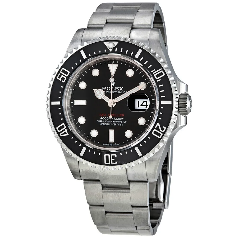 Stainless steel case with a stainless steel Rolex oyster bracelet. Uni-directional rotating stainless steel bezel with a black ceramic ring. Black dial with silver-tone Mercedes-logo, sword, and Breguet-style hands and dot hour markers. Minute markers around the outer rim. Dial Type: Analog. Luminescent hands and markers. Date display at the 3 o'clock position. Rolex calibre 3235 automatic movement with a 70-hour power reserve. Scratch resistant sapphire crystal. Screw down crown. Solid case back. Round case shape. Case size: 43 mm. Oysterlock clasp. Water resistant at 1200 meters / 4000 feet. Functions: date, hour, minute, second, chronometer. Dive watch style. Watch label: Swiss Made. Rolex Oyster Perpetual Sea-Dweller 43 mm Ceramic Bezel Stainless Steel Men's Watch 126600BKSO. CASE Case Size: 43 Case Color: Silver-Tone Case Material: Stainless Steel Case Shape: Round Case Back: Solid BAND Band Material: Stainless Steel Rolex Oyster Band Type: Bracelet Band Color: Silver-tone Clasp: Oysterlock DIAL Dial Color: Black Type: Analog Crystal: Scratch Resistant Sapphire Hands: Silver-tone Mercedes-logo, sword, and Breguet-style Dial Markers: Dot Second Markers: Minute Markers around the outer rim Luminiscence: Hands and Markers Bezel: Uni-directional Rotating Bezel Color: Black Ceramic Top Ring Bezel Material: Stainless Steel Crown: Screw Down INFORMATION Brand: Rolex Series: Oyster Perpetual Collection Name: Oyster Perpetual Gender: Mens Model: M126600-0002 Watch Label: Swiss Made Movement: Automatic Engine: Rolex Calibre 3235 Power Reserve: 70 hours FEATURES Water Resistance: 1200 meters / 4000 feet Calendar: Date display at the 3 o'clock position Functions: Date, Hour, Minute, Second, Chronometer Watch Features: Stainless Steel, Ceramic, Perpetual, Chronometer, Analog ADDITIONAL INFO Watch Style: Dive Warranty: 2 Year Jomashop Warranty UPC Code: 842047117743 Jomashop Sku: RLX126600BKSO Item Variation: 126600-0001 Department: Watches Category: Watches