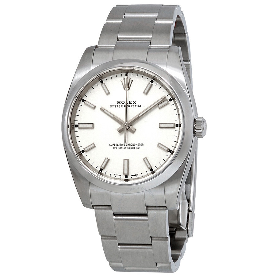 Stainless steel case with a stainless steel Rolex oyster bracelet. Fixed, domed stainless steel bezel. White dial with luminous silver-tone hands and index hour markers. Minute markers around the outer rim. Dial Type: Analog. Luminescent hands and markers. Rolex calibre 3130 automatic movement with a 48-hour power reserve. Scratch resistant sapphire crystal. Screw down crown. Solid case back. Round case shape. Case size: 34 mm. Oyster clasp. Water resistant at 100 meters / 330 feet. Functions: hour, minute, second. Luxury watch style. Watch label: Swiss Made. Rolex Oyster Perpetual White Dial Automatic Men's Stainless Steel Oyster Watch 114200WSO. CASE Case Size: 34 Case Color: Silver-Tone Case Material: Stainless Steel Case Shape: Round Case Back: Solid BAND Band Material: Stainless Steel Rolex Oyster Band Type: Bracelet Band Color: Silver-tone Clasp: Oysterclasp DIAL Dial Color: White Type: Analog Crystal: Scratch Resistant Sapphire Hands: Silver-tone Dial Markers: Index Second Markers: Minute Markers around the outer rim Luminiscence: Hands and Markers Bezel: Fixed Domed Bezel Color: Silver-tone Bezel Material: Stainless Steel Crown: Screw Down INFORMATION Brand: Rolex Series: Oyster Perpetual Collection Name: Oyster Perpetual Gender: Mens Model: 114200WSO Watch Label: Swiss Made Movement: Automatic Engine: Rolex Calibre 3130 Power Reserve: 48 hours FEATURES Water Resistance: 100 meters / 330 feet Functions: Hour, Minute, Second Watch Features: Stainless Steel, Perpetual, Analog ADDITIONAL INFO Watch Style: Luxury Warranty: 2 Year Jomashop Warranty UPC Code: 842047137949 Jomashop Sku: RLX114200WSO Department: Watches Category: Watches