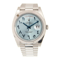 Platinum case with a platinum bracelet. Fixed platinum bezel. Blue dial with blue hands and Arabic script hour markers. Minute markers around the outer rim. Dial Type: Analog. Date display at the 3 o'clock position. day of the week diplay centered on the 12 o'clock position. Rolex calibre 3255 automatic movement, based upon Rolex 3035, containing 31 Jewels, bitting at 28800 vph, and has a power reserve of approximately 70 hours. Scratch resistant sapphire crystal. Screw down crown. Solid case back. Round case shape. Case size: 40 mm. Fold over clasp. Water resistant at 100 meters / 330 feet. Functions: date, day, hour, minute, second, chronometer, shock resistant, magnetic resistant. President Series. Luxury watch style. Watch label: Swiss Made. Rolex President Automatic Chronometer Blue "Arabic Dial" Dial Men's Watch M228206-0025. CASE Case Size: 40 Case Material: Platinum Case Shape: Round Case Back: Solid BAND Band Material: Platinum 1 Band Type: Bracelet Band Color: Silver-tone Clasp: Fold Over DIAL Dial Color: Blue Type: Analog Crystal: Scratch Resistant Sapphire Hands: Blue Dial Markers: Arabic Script Second Markers: Minute Markers around the outer rim Bezel: Fixed Bezel Color: Silver-tone Bezel Material: Platinum Crown: Screw Down INFORMATION Brand: Rolex Series: Oyster Perpetual Collection Name: Oyster Perpetual Gender: Mens Model: M228206-0025 Watch Label: Swiss Made Movement: Automatic Engine: Rolex Calibre 3255 Power Reserve: 70 hours FEATURES Water Resistance: 100 meters / 330 feet Calendar: Date display at the 3 o'clock position. Day of the Week diplay centered on the 12 o'clock position Functions: Date, Day, Hour, Minute, Second, Chronometer, Shock Resistant, Magnetic Resistant Watch Features: Perpetual, Chronometer, Platinum, Analog ADDITIONAL INFO Watch Style: Luxury Warranty: 2 Year Jomashop Warranty Jomashop Sku: RLX228206-0025 Item Variation: M228206-0025, 228206-0025 Department: Watches Category: Watches