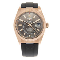 18kt rose gold case with a black oysterflex (rubber) strap. Bi-directional rotating 18kt rose gold bezel. Dark rhodium dial with index hour markers. Dial Type: Analog. Date display at the 3 o'clock position. One subdial displaying: 24 hour. Rolex Calibre 9001 Automatic movement, containing 40 Jewels, composed of 380 parts, bitting at 28800 vph, and has a power reserve of approximately 72 hours. Scratch resistant sapphire crystal. Screw down crown. Solid case back. Round case shape, case size: 42 mm. Oysterlock clasp. Water resistant at 100 meters / 330 feet. Functions: annual calendar, month, date, GMT, second time zone, hour, minute, second, chronometer. Sky-dweller Series. Luxury watch style. Watch label: Swiss Made. Item Variations: M326235-0006. Rolex Sky-Dweller Automatic Chronometer 18kt Rose Gold Dark Rhodium Dial Men's Watch 326235DRSR. CASE Case Size: 42 Case Material: 18kt Rose Gold Case Shape: Round Case Back: Solid BAND Band Material: Oysterflex (Rubber) Band Type: Strap Band Color: Black Clasp: Oysterlock DIAL Dial Color: Dark Rhodium Type: Analog Crystal: Scratch Resistant Sapphire Dial Markers: Index Sub Dials: One - 24 Hour Bezel: Bi-directional Rotating Bezel Material: 18kt Rose Gold Crown: Screw Down INFORMATION Brand: Rolex Series: Sky Dweller Collection Name: Sky Dweller Gender: Mens Model: 326235DRSR Watch Label: Swiss Made Movement: Automatic Engine: Rolex Calibre 9001 Power Reserve: 72 hours FEATURES Water Resistance: 100 meters / 330 feet Calendar: Date display at the 3 o'clock position Functions: Annual Calendar, Month, Date, GMT, Second Time Zone, Hour, Minute, Second, Chronometer Watch Features: Analog, GMT, Annual Calendar, Chronometer, Month, Gold, Rubber, Time Zone ADDITIONAL INFO Watch Style: Luxury Warranty: 2 Year Jomashop Warranty Jomashop Sku: RLX326235DRSR Item Variation: M326235-0006 Department: Watches Category: Watches