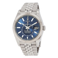 Silver-tone stainless steel case with a stainless steel Rolex jubilee bracelet with 18kt white gold center links. Fluted ring command 18kt white gold bezel. Blue dial with luminous silver-tone hands and index hour markers. Minute markers around the outer rim. Dial Type: Analog. Luminescent hands and markers. Date display at the 3 o'clock position. 24 hours sub-dial. Rolex calibre 9001 automatic movement, containing 40 Jewels, composed of 380 parts, bitting at 28800 vph, and has a power reserve of approximately 72 hours. Scratch resistant sapphire crystal. Screw down crown. Solid case back. Round case shape. Case size: 42 mm. Oysterlock clasp. Water resistant at 100 meters / 330 feet. Functions: annual calendar, month, date, GMT, second time zone, hour, minute, second, chronometer. Sky-dweller Series. Luxury watch style. Watch label: Swiss Made. Rolex Sky-Dweller Automatic Chronometer Blue Dial Men's Watch 326934BLSJ. INFORMATION Brand: Rolex Series: Sky Dweller Collection Name: Sky Dweller Gender: Mens Model: 326934BLSJ Watch Label: Swiss Made Movement: Automatic Engine: Rolex Calibre 9001 Power Reserve: 72 hours CASE Case Size: 42 mm Case Material: Stainless Steel Case Shape: Round Case Back: Solid BAND Band Material: Stainless Steel with 18kt White Gold Rolex Jubilee Band Type: Bracelet Clasp: Oysterlock DIAL Dial Color: Blue Type: Analog Crystal: Scratch Resistant Sapphire Hands: Luminous Silver-tone Dial Markers: Index Second Markers: Minute Markers around the outer rim Sub Dials: 24 Hours Luminiscence: Hands and Markers Bezel: Fluted Ring Command Bezel Material: 18kt White Gold Crown: Screw Down FEATURES Water Resistance: 100 meters / 330 feet Calendar: Date display at the 3 o'clock position Functions: Annual Calendar, Month, Date, GMT, Second Time Zone, Hour, Minute, Second, Chronometer Watch Features: Analog, GMT, Annual Calendar, Chronometer, Month, Gold, Stainless Steel, Time Zone ADDITIONAL INFO Watch Style: Luxury Warranty: 2 Year Jomashop Warranty Jomashop Sku: RLX326934BLSJ Item Variation: M326934-0004 Department: Watches Category: Watches