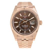 Rose gold-tone 18 kt everose gold case and bracelet. Bi-directional rotating rose gold-tone 18 kt everose gold bezel. Chocolate dial with rose gold-tone hands and index hour markers. Minute scale around the inner rim. Dial Type: Analog. Luminescent hands and markers. Date display at the 3 o'clock position. 24-hour display on off-centre disc subdials. Rolex Calibre 9002 Automatic movement, based upon Rolex Calibre 9001, containing 40 Jewels, bitting at 28800 vph, and has a power reserve of approximately 72 hours. Scratch resistant sapphire crystal. Screw down crown. Solid case back. Round case shape, case size: 42 mm. Fold over clasp. Water resistant at 100 meters / 330 feet. Functions: date, hour, minute, second. Sky Dweller Series. Sport watch style. Watch label: Swiss Made. Item Variations: 336935-0006. Rolex Sky Dweller Automatic Men's Watch M336935-0006. GENERAL Box Type: Original Box CASE Case Diameter: 42 mm Case Material: 18 kt Everose Gold Case Shape: Round Case Back: Solid BAND Band Material: 18 kt Everose Gold Band Type: Bracelet Band Color: Rose Gold-tone Clasp: Fold Over DIAL Dial Color: Chocolate Type: Analog Crystal: Scratch Resistant Sapphire Hands: Rose Gold-tone Dial Markers: Index Second Markers: Minute Scale around the inner rim Sub Dials: 24-hour display on off-centre disc Luminiscence: Hands and Markers Bezel: Bi-directional Rotating Bezel Color: Rose Gold-tone Bezel Material: 18 kt Everose Gold Crown: Screw Down INFORMATION Brand: Rolex Series: Sky-Dweller Collection Name: Sky Dweller Gender: Mens Model: M336935-0006 Watch Label: Swiss Made Movement: Automatic Engine: Rolex Calibre 9002 Power Reserve: 72 hours FEATURES Water Resistance: 100 meters / 330 feet Calendar: Date display at the 3 o'clock position Functions: Date, Hour, Minute, Second Watch Features: Gold, Analog ADDITIONAL INFO Watch Style: Sport Warranty: 2 Year Jomashop Warranty Jomashop Sku: RLX336935-0006 Item Variation: 336935-0006 Department: Watches