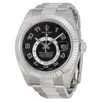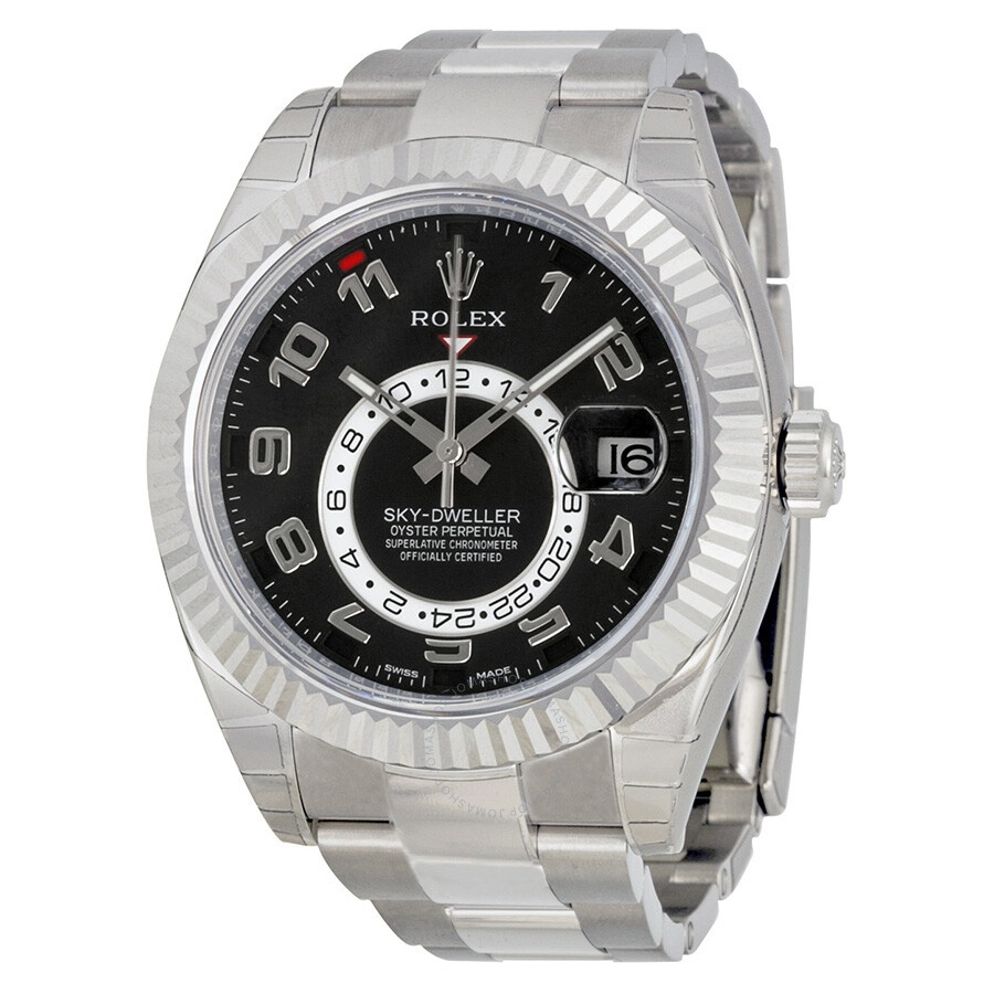 18k white gold case with a white gold-tone 18kt white gold rolex oyster bracelet. Bi-directional rotating ring command 18kt yellow gold bezel. Black dial with silver-tone hands and Roman numeral hour markers. Minute markers around the outer rim. Dial Type: Analog. Luminescent hands. "saros" annual calendar. 24 hour sub-dial subdials. Rolex Calibre 9001 automatic movement with a 72-hour power reserve. Scratch resistant sapphire crystal. Screw down crown. Round case shape. Case size: 42 mm. Oysterlock clasp. Water resistant at 100 meters / 330 feet. Functions: annual calendar, GMT, second time zone, month, date, hour, minute, second, chronometer. Luxury watch style. Watch label: Swiss Made. Rolex Sky Dweller Black Dial 18K White Gold Oyster Bracelet Automatic Men's Watch 326939BKAO. CASE Case Size: 42 Case Material: 18kt White Gold Case Shape: Round Case Back: Solid BAND Band Material: 18kt White Gold Rolex Oyster Band Type: Bracelet Band Color: White Gold-tone Clasp: Oysterlock DIAL Dial Color: Black Type: Analog Crystal: Scratch Resistant Sapphire Hands: Silver-tone Dial Markers: Roman Numeral Second Markers: Minute Markers around the outer rim Sub Dials: One - 24 Hour Luminiscence: Hands Bezel: Bi-directional Rotating Ring Command Bezel Material: 18kt Yellow Gold Crown: Screw Down INFORMATION Brand: Rolex Series: Sky Dweller Collection Name: Sky Dweller Gender: Mens Model: 326939BKAO Watch Label: Swiss Made Movement: Automatic Engine: Rolex Calibre 9001 Power Reserve: 72 hours FEATURES Water Resistance: 100 meters / 330 feet Calendar: "Saros" Annual Calendar Functions: Annual Calendar, GMT, Second Time Zone, Month, Date, Hour, Minute, Second, Chronometer Watch Features: Analog, GMT, Annual Calendar, Chronometer, Month, Gold, Time Zone ADDITIONAL INFO Watch Style: Luxury Warranty: 2 Year Jomashop Warranty UPC Code: 845960064705 Jomashop Sku: RLX326939BKAO Department: Watches Category: Watches