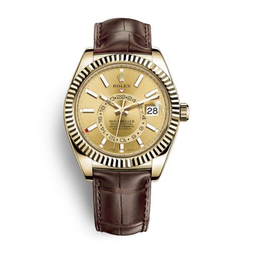 18kt yellow gold case with a tobacco leather strap. Fluted ring command 18kt yellow gold bezel. Champagne dial with yellow gold hands and index hour markers. Dial Type: Analog. Luminescent hands and markers. Date display at the 3 o'clock position. One - 24 hour subdial. Rolex Calibre 9001 automatic movement with a 72-hour power reserve. Scratch resistant sapphire crystal. Screw down crown. Solid case back. Round case shape. Case size: 42 mm. Folding clasp. Water resistant at 100 meters / 330 feet. Functions: annual calendar, month, date, GMT, second time zone, hour, minute, second, chronometer. Luxury watch style. Watch label: Swiss Made. Rolex Sky-Dweller Champagne Dial Automatic 18kt Yellow Gold Men's Leather Watch 326138CSL. CASE Case Size: 42 Case Material: 18kt Yellow Gold Case Shape: Round Case Back: Solid BAND Band Material: Leather Band Type: Strap Band Color: Tobacco Clasp: Folding DIAL Dial Color: Champagne Type: Analog Crystal: Scratch Resistant Sapphire Hands: Yellow Gold Dial Markers: Index Sub Dials: One - 24 Hour Luminiscence: Hands and Markers Bezel: Fluted Ring Command Bezel Material: 18kt Yellow Gold Crown: Screw Down INFORMATION Brand: Rolex Series: Sky Dweller Collection Name: Sky Dweller Gender: Mens Model: 326138CSL Watch Label: Swiss Made Movement: Automatic Engine: Rolex Calibre 9001 Power Reserve: 72 hours FEATURES Water Resistance: 100 meters / 330 feet Calendar: Date display at the 3 o'clock position Functions: Annual Calendar, Month, Date, GMT, Second Time Zone, Hour, Minute, Second, Chronometer Watch Features: Analog, GMT, Annual Calendar, Chronometer, Month, Gold, Leather, Time Zone ADDITIONAL INFO Watch Style: Luxury Warranty: 2 Year Jomashop Warranty Jomashop Sku: RLX326138CSL Department: Watches Category: Watches