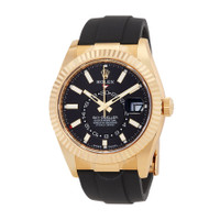 Yellow gold-tone 18kt yellow gold case with a black rubber strap. Bi-directional rotating ring command yellow gold-tone 18kt yellow gold bezel. Black dial with yellow gold-tone hands and index hour markers. Minute markers around the outer rim. Dial Type: Analog. Luminescent hands and markers. Date display at the 3 o'clock position. One subdial displaying: 24 hour. Rolex Calibre 9002 Automatic movement, based upon Rolex Calibre 9001, containing 40 Jewels, bitting at 28800 vph, and has a power reserve of approximately 72 hours. Scratch resistant sapphire crystal. Screw down crown. Solid case back. Round case shape, case size: 42 mm. Fold over clasp with a safety release. Water resistant at 100 meters / 330 feet. Functions: annual calendar, month, date, GMT, second time zone, hour, minute, second, chronometer. Additional Info: original box, international warranty card, manual (complete accessories). Sky-dweller Series. Luxury watch style. Watch label: Swiss Made. Rolex Sky-Dweller GMT Aut CASE Case Size: 42 Case Material: 18kt Yellow Gold Case Shape: Round Case Back: Solid BAND Band Material: Rubber Band Type: Strap Band Color: Black Clasp: Fold Over with Safety Release DIAL Dial Color: Black Type: Analog Crystal: Scratch Resistant Sapphire Hands: Yellow Gold-tone Dial Markers: Index Second Markers: Minute Markers around the outer rim Sub Dials: One - 24 Hour Luminiscence: Hands and Markers Bezel: Bi-directional Rotating Ring Command Bezel Color: Yellow Gold-tone Bezel Material: 18kt Yellow Gold Crown: Screw Down INFORMATION Brand: Rolex Series: Sky Dweller Collection Name: Sky Dweller Gender: Mens Model: 336238-0002 Watch Label: Swiss Made Movement: Automatic Engine: Rolex Calibre 9002 Power Reserve: 72 hours FEATURES Water Resistance: 100 meters / 330 feet Calendar: Date display at the 3 o'clock position Functions: Annual Calendar, Month, Date, GMT, Second Time Zone, Hour, Minute, Second, Chronometer Watch Features: Analog, GMT, Annual Calendar, Chronometer, Month, Gold, Rubber, Time Zone ADDITIONAL INFO Watch Style: Luxury Warranty: 2 Year Jomashop Warranty Additional Info: Original Box, Manual (Complete Accessories) Jomashop Sku: RLX336238BKSR Department: Watches Category: Watches
