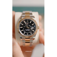 Silver-tone stainless steel case with a two-tone (silver-tone and yellow gold-tone) stainless steel and 18kt yellow gold oyster bracelet. Bi-directional rotating ring command yellow gold-tone 18kt yellow gold bezel. Black dial with yellow gold-tone hands and index hour markers. Minute markers around the outer rim. Dial Type: Analog. Luminescent hands and markers. Date display at the 3 o'clock position. One subdial displaying: 24 hour. Rolex Calibre 9002 Automatic movement, based upon Rolex Calibre 9001, containing 40 Jewels, bitting at 28800 vph, and has a power reserve of approximately 72 hours. Scratch resistant sapphire crystal. Screw down crown. Solid case back. Round case shape, case size: 42 mm. Fold over clasp with a safety release. Water resistant at 100 meters / 330 feet. Functions: annual calendar, month, date, GMT, second time zone, hour, minute, second, chronometer. Additional Info: original box, international warranty card, manual (complete accessories). Sky-dweller Series CASE Case Size: 42 mm Case Material: Stainless Steel Case Shape: Round Case Back: Solid BAND Band Material: Stainless Steel and 18kt Yellow Gold Oyster Band Type: Bracelet Band Color: Two-tone (Silver-tone and Yellow Gold-tone) Clasp: Fold Over with Safety Release DIAL Dial Color: Black Type: Analog Crystal: Scratch Resistant Sapphire Hands: Yellow Gold-tone Dial Markers: Index Second Markers: Minute Markers around the outer rim Sub Dials: One - 24 Hour Luminiscence: Hands and Markers Bezel: Bi-directional Rotating Ring Command Bezel Color: Yellow Gold-tone Bezel Material: 18kt Yellow Gold Crown: Screw Down INFORMATION Brand: Rolex Series: Sky Dweller Collection Name: Sky Dweller Gender: Mens Model: 336933-0003 Watch Label: Swiss Made Movement: Automatic Engine: Rolex Calibre 9002 Power Reserve: 72 hours FEATURES Water Resistance: 100 meters / 330 feet Calendar: Date display at the 3 o'clock position Functions: Annual Calendar, Month, Date, GMT, Second Time Zone, Hour, Minute, Second, Chronometer Watch Features: Analog, GMT, Annual Calendar, Chronometer, Month, Gold, Stainless Steel, Time Zone ADDITIONAL INFO Watch Style: Luxury Warranty: 2 Year Jomashop Warranty Additional Info: Original Box, International Warranty Card, Manual (Complete Accessories) Jomashop Sku: RLX336933BKSO Department: Watches Category: Watches