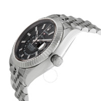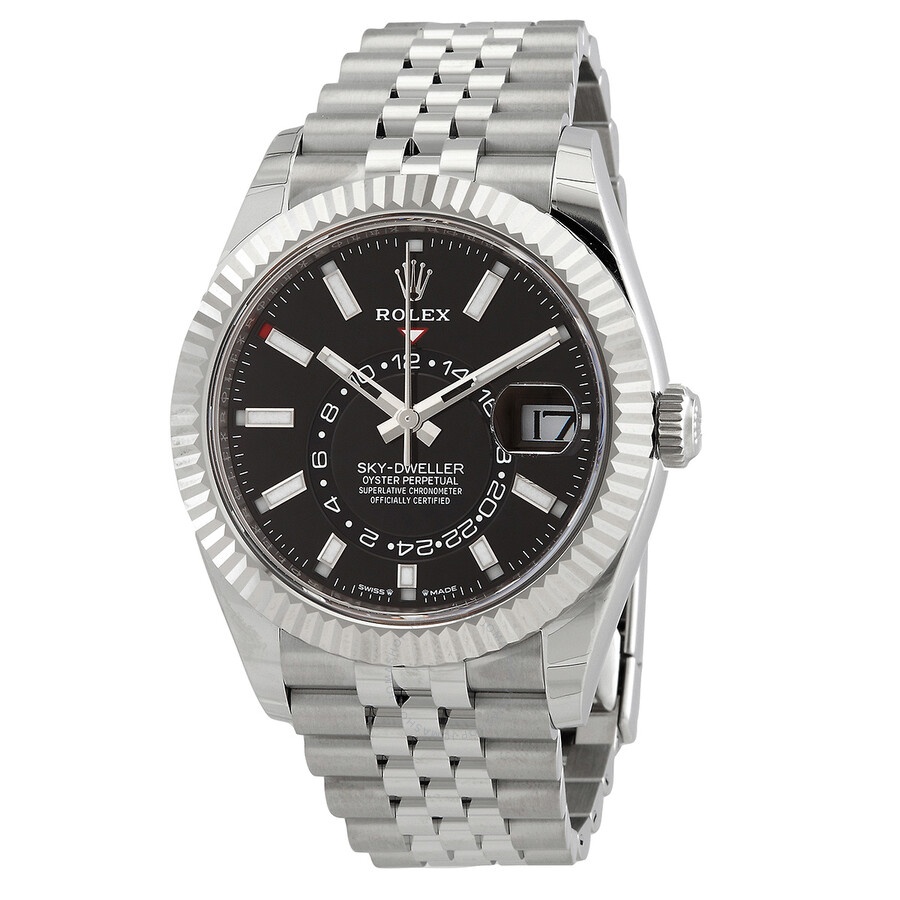 Silver-tone stainless steel case with a silver-tone stainless steel jubilee bracelet. Bi-directional rotating ring command 18kt white gold bezel. Black dial with silver-tone hands and index hour markers. Minute markers around the outer rim. Dial Type: Analog. Luminescent hands and markers. Date display at the 3 o'clock position. One subdial displaying: 24 hour. Rolex Calibre 9002 Automatic movement, based upon Rolex Calibre 9001, containing 40 Jewels, bitting at 28800 vph, and has a power reserve of approximately 72 hours. Scratch resistant sapphire crystal. Screw down crown. Solid case back. Round case shape, case size: 42 mm. Fold over clasp with a safety release. Water resistant at 100 meters / 330 feet. Functions: annual calendar, month, date, GMT, second time zone, hour, minute, second, chronometer. Additional Info: original box, international warranty card, manual (complete accessories). Sky-dweller Series. Luxury watch style. Watch label: Swiss Made. Rolex Sky-Dweller GMT Automatic Chronometer Black Dial Men's Watch 336934-0008. INFORMATION Brand: Rolex Series: Sky Dweller Collection Name: Sky Dweller Gender: Mens Model: 336934-0008 Watch Label: Swiss Made Movement: Automatic Engine: Rolex Calibre 9002 Power Reserve: 72 hours CASE Case Size: 42 mm Case Material: Stainless Steel Case Shape: Round Case Back: Solid BAND Band Material: Stainless Steel Jubilee Band Type: Bracelet Band Color: Silver-tone Clasp: Fold Over with Safety Release DIAL Dial Color: Black Type: Analog Crystal: Scratch Resistant Sapphire Hands: Silver-tone Dial Markers: Index Second Markers: Minute Markers around the outer rim Sub Dials: One - 24 Hour Luminiscence: Hands and Markers Bezel: Bi-directional Rotating Ring Command Bezel Material: 18kt White Gold Crown: Screw Down FEATURES Water Resistance: 100 meters / 330 feet Calendar: Date display at the 3 o'clock position Functions: Annual Calendar, Month, Date, GMT, Second Time Zone, Hour, Minute, Second, Chronometer Watch Features: Analog, GMT, Annual Calendar, Chronometer, Month, Gold, Stainless Steel, Time Zone ADDITIONAL INFO Watch Style: Luxury Warranty: 2 Year Jomashop Warranty Additional Info: Original Box, International Warranty Card, Manual (Complete Accessories) Jomashop Sku: RLX336934BKSJ Department: Watches Category: Watches