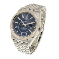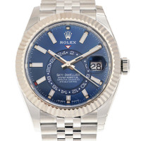 Stainless steel case with a silver-tone stainless steel jubilee bracelet. Bi-directional rotating ring command 18kt white gold bezel. Blue dial with silver-tone hands and index hour markers. Minute markers around the outer rim. Dial Type: Analog. Luminescent hands and markers. Date display at the 3 o'clock position. One subdial displaying: 24 hour. Rolex Calibre 9002 Automatic movement, based upon Rolex Calibre 9001, containing 40 Jewels, bitting at 28800 vph, and has a power reserve of approximately 72 hours. Scratch resistant sapphire crystal. Screw down crown. Solid case back. Round case shape, case size: 42 mm. Fold over clasp with a safety release. Water resistant at 100 meters / 330 feet. Functions: annual calendar, month, date, GMT, second time zone, hour, minute, second, chronometer. Additional Info: original box, international warranty card, manual (complete accessories). Sky-dweller Series. Luxury watch style. Watch label: Swiss Made. Rolex Sky-Dweller GMT Automatic Chronometer Blue Dial Men's Watch 336934-0006. INFORMATION Brand: Rolex Series: Sky Dweller Collection Name: Sky Dweller Gender: Mens Model: 336934-0006 Watch Label: Swiss Made Movement: Automatic Engine: Rolex Calibre 9002 Power Reserve: 72 hours CASE Case Size: 42 mm Case Material: Stainless Steel Case Shape: Round Case Back: Solid BAND Band Material: Stainless Steel Jubilee Band Type: Bracelet Band Color: Silver-tone Clasp: Fold Over with Safety Release DIAL Dial Color: Blue Type: Analog Crystal: Scratch Resistant Sapphire Hands: Silver-tone Dial Markers: Index Second Markers: Minute Markers around the outer rim Sub Dials: One - 24 Hour Luminiscence: Hands and Markers Bezel: Bi-directional Rotating Ring Command Bezel Material: 18kt White Gold Crown: Screw Down FEATURES Water Resistance: 100 meters / 330 feet Calendar: Date display at the 3 o'clock position Functions: Annual Calendar, Month, Date, GMT, Second Time Zone, Hour, Minute, Second, Chronometer Watch Features: Analog, GMT, Annual Calendar, Chronometer, Month, Gold, Stainless Steel, Time Zone ADDITIONAL INFO Watch Style: Luxury Warranty: 2 Year Jomashop Warranty Additional Info: Original Box, International Warranty Card, Manual (Complete Accessories) Jomashop Sku: RLX336934BLSJ Department: Watches Category: Watches