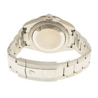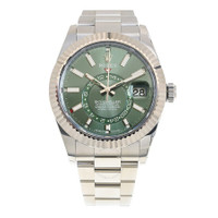 Silver-tone stainless steel case with a silver-tone stainless steel oyster bracelet. Bi-directional rotating ring command 18kt white gold bezel. Green dial with silver-tone hands and index hour markers. Minute markers around the outer rim. Dial Type: Analog. Luminescent hands and markers. Date display at the 3 o'clock position. One subdial displaying: 24 hour. Rolex Calibre 9002 Automatic movement, based upon Rolex Calibre 9001, containing 40 Jewels, bitting at 28800 vph, and has a power reserve of approximately 72 hours. Scratch resistant sapphire crystal. Screw down crown. Solid case back. Round case shape, case size: 42 mm. Fold over clasp with a safety release. Water resistant at 100 meters / 330 feet. Functions: annual calendar, month, date, GMT, second time zone, hour, minute, second, chronometer. Additional Info: original box, manual (complete accessories). Sky-dweller Series. Luxury watch style. Watch label: Swiss Made. Rolex Sky-Dweller GMT Automatic Chronometer Green Dial Men's Watch 336934-0001. CASE Case Size: 42 Case Material: Stainless Steel Case Shape: Round Case Back: Solid BAND Band Material: Stainless Steel Oyster Band Type: Bracelet Band Color: Silver-tone Clasp: Fold Over with Safety Release DIAL Dial Color: Green Type: Analog Crystal: Scratch Resistant Sapphire Hands: Silver-tone Dial Markers: Index Second Markers: Minute Markers around the outer rim Sub Dials: One - 24 Hour Luminiscence: Hands and Markers Bezel: Bi-directional Rotating Ring Command Bezel Material: 18kt White Gold Crown: Screw Down INFORMATION Brand: Rolex Series: Sky Dweller Collection Name: Sky Dweller Gender: Mens Model: 336934-0001 Watch Label: Swiss Made Movement: Automatic Engine: Rolex Calibre 9002 Power Reserve: 72 hours FEATURES Water Resistance: 100 meters / 330 feet Calendar: Date display at the 3 o'clock position Functions: Annual Calendar, Month, Date, GMT, Second Time Zone, Hour, Minute, Second, Chronometer Watch Features: Analog, GMT, Annual Calendar, Chronometer, Month, Gold, Stainless Steel, Time Zone ADDITIONAL INFO Watch Style: Luxury Warranty: 2 Year Jomashop Warranty Additional Info: Original Box, Manual (Complete Accessories) Jomashop Sku: RLX336934GNSO Department: Watches Category: Watches