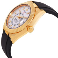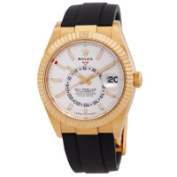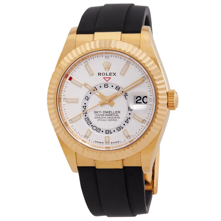 Yellow gold-tone 18kt yellow gold case with a black rubber strap. Bi-directional rotating ring command yellow gold-tone 18kt yellow gold bezel. White dial with yellow gold-tone hands and index hour markers. Minute markers around the outer rim. Dial Type: Analog. Luminescent hands and markers. Date display at the 3 o'clock position. One subdial displaying: 24 hour. Rolex Calibre 9002 Automatic movement, based upon Rolex Calibre 9001, containing 40 Jewels, bitting at 28800 vph, and has a power reserve of approximately 72 hours. Scratch resistant sapphire crystal. Screw down crown. Solid case back. Round case shape, case size: 42 mm. Fold over clasp with a safety release. Water resistant at 100 meters / 330 feet. Functions: annual calendar, month, date, GMT, second time zone, hour, minute, second, chronometer. Additional Info: original box, international warranty card, manual (complete accessories). Sky-dweller Series. Luxury watch style. Watch label: Swiss Made. Rolex Sky-Dweller GMT Aut GENERAL Box Type: Original Box CASE Case Diameter: 42 mm Case Material: 18kt Yellow Gold Case Shape: Round Case Back: Solid BAND Band Material: Rubber Band Type: Strap Band Color: Black Clasp: Fold Over with Safety Release DIAL Dial Color: White Type: Analog Crystal: Scratch Resistant Sapphire Hands: Yellow Gold-tone Dial Markers: Index Second Markers: Minute Markers around the outer rim Sub Dials: One - 24 Hour Luminiscence: Hands and Markers Bezel: Bi-directional Rotating Ring Command Bezel Color: Yellow Gold-tone Bezel Material: 18kt Yellow Gold Crown: Screw Down INFORMATION Brand: Rolex Series: Sky-Dweller Collection Name: Sky-Dweller Gender: Mens Model: 336238-0003 Watch Label: Swiss Made Movement: Automatic Engine: Rolex Calibre 9002 Power Reserve: 72 hours FEATURES Water Resistance: 100 meters / 330 feet Calendar: Date display at the 3 o'clock position Functions: Annual Calendar, Month, Date, GMT, Second Time Zone, Hour, Minute, Second, Chronometer Watch Features: Month, Analog, GMT, Annual Calendar, Chronometer, Gold, Rubber, Time Zone ADDITIONAL INFO Watch Style: Luxury Warranty: 2 Year Jomashop Warranty Additional Info: Original Box, Manual (Complete Accessories) Jomashop Sku: RLX336238WSR Department: Watches Category: Watches