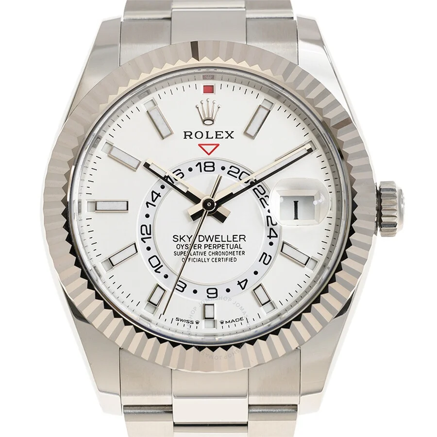 Silver-tone stainless steel case with a silver-tone stainless steel oyster bracelet. Bi-directional rotating ring command 18kt white gold bezel. White dial with silver-tone hands and index hour markers. Minute markers around the outer rim. Dial Type: Analog. Luminescent hands and markers. Date display at the 3 o'clock position. One subdial displaying: 24 hour. Rolex Calibre 9002 Automatic movement, based upon Rolex Calibre 9001, containing 40 Jewels, bitting at 28800 vph, and has a power reserve of approximately 72 hours. Scratch resistant sapphire crystal. Screw down crown. Solid case back. Round case shape, case size: 42 mm. Fold over clasp with a safety release. Water resistant at 100 meters / 330 feet. Functions: annual calendar, month, date, GMT, second time zone, hour, minute, second, chronometer. Additional Info: original box, manual (complete accessories). Sky-dweller Series. Luxury watch style. Watch label: Swiss Made. Rolex Sky-Dweller GMT Automatic Chronometer White Dial Men's Watch 336934-0003. CASE Case Size: 42 Case Material: Stainless Steel Case Shape: Round Case Back: Solid BAND Band Material: Stainless Steel Oyster Band Type: Bracelet Band Color: Silver-tone Clasp: Fold Over with Safety Release DIAL Dial Color: White Type: Analog Crystal: Scratch Resistant Sapphire Hands: Silver-tone Dial Markers: Index Second Markers: Minute Markers around the outer rim Sub Dials: One - 24 Hour Luminiscence: Hands and Markers Bezel: Bi-directional Rotating Ring Command Bezel Material: 18kt White Gold Crown: Screw Down INFORMATION Brand: Rolex Series: Sky Dweller Collection Name: Sky Dweller Gender: Mens Model: 336934-0003 Watch Label: Swiss Made Movement: Automatic Engine: Rolex Calibre 9002 Power Reserve: 72 hours FEATURES Water Resistance: 100 meters / 330 feet Calendar: Date display at the 3 o'clock position Functions: Annual Calendar, Month, Date, GMT, Second Time Zone, Hour, Minute, Second, Chronometer Watch Features: Analog, GMT, Annual Calendar, Chronometer, Month, Gold, Stainless Steel, Time Zone ADDITIONAL INFO Watch Style: Luxury Warranty: 2 Year Jomashop Warranty Additional Info: Original Box, Manual (Complete Accessories) Jomashop Sku: RLX336934WSO Department: Watches Category: Watches