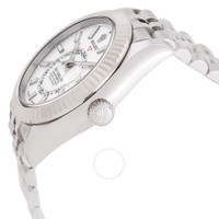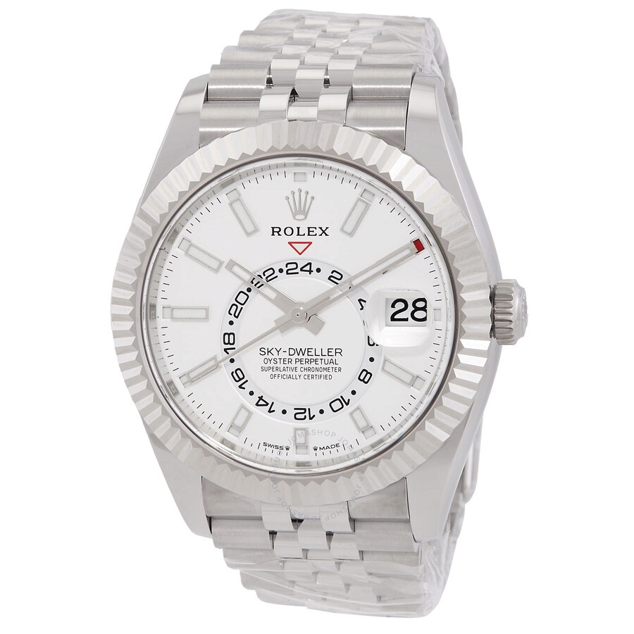 Silver-tone stainless steel case with a silver-tone stainless steel jubilee bracelet. Bi-directional rotating ring command 18kt white gold bezel. White dial with silver-tone hands and index hour markers. Minute markers around the outer rim. Dial Type: Analog. Luminescent hands and markers. Date display at the 3 o'clock position. One subdial displaying: 24 hour. Rolex Calibre 9002 Automatic movement, based upon Rolex Calibre 9001, containing 40 Jewels, bitting at 28800 vph, and has a power reserve of approximately 72 hours. Scratch resistant sapphire crystal. Screw down crown. Solid case back. Round case shape, case size: 42 mm. Fold over clasp with a safety release. Water resistant at 100 meters / 330 feet. Functions: annual calendar, month, date, GMT, second time zone, hour, minute, second, chronometer. Additional Info: original box, manual (complete accessories). Sky-dweller Series. Luxury watch style. Watch label: Swiss Made. Rolex Sky-Dweller GMT Automatic Chronometer White Dial Men's Watch 336934-0004. GENERAL Box Type: Original Box CASE Case Size: 42 Case Material: Stainless Steel Case Shape: Round Case Back: Solid BAND Band Material: Stainless Steel Jubilee Band Type: Bracelet Band Color: Silver-tone Clasp: Fold Over with Safety Release DIAL Dial Color: White Type: Analog Crystal: Scratch Resistant Sapphire Hands: Silver-tone Dial Markers: Index Second Markers: Minute Markers around the outer rim Sub Dials: One - 24 Hour Luminiscence: Hands and Markers Bezel: Bi-directional Rotating Ring Command Bezel Material: 18kt White Gold Crown: Screw Down INFORMATION Brand: Rolex Series: Sky-Dweller Collection Name: Sky Dweller Gender: Mens Model: 336934-0004 Watch Label: Swiss Made Movement: Automatic Engine: Rolex Calibre 9002 Power Reserve: 72 hours FEATURES Water Resistance: 100 meters / 330 feet Calendar: Date display at the 3 o'clock position Functions: Annual Calendar, Month, Date, GMT, Second Time Zone, Hour, Minute, Second, Chronometer Watch Features: Month, Analog, GMT, Annual Calendar, Chronometer, Gold, Stainless Steel, Time Zone ADDITIONAL INFO Watch Style: Luxury Warranty: 2 Year Jomashop Warranty Additional Info: Original Box, Manual (Complete Accessories) Jomashop Sku: RLX336934WSJ Department: Watches Category: Watches