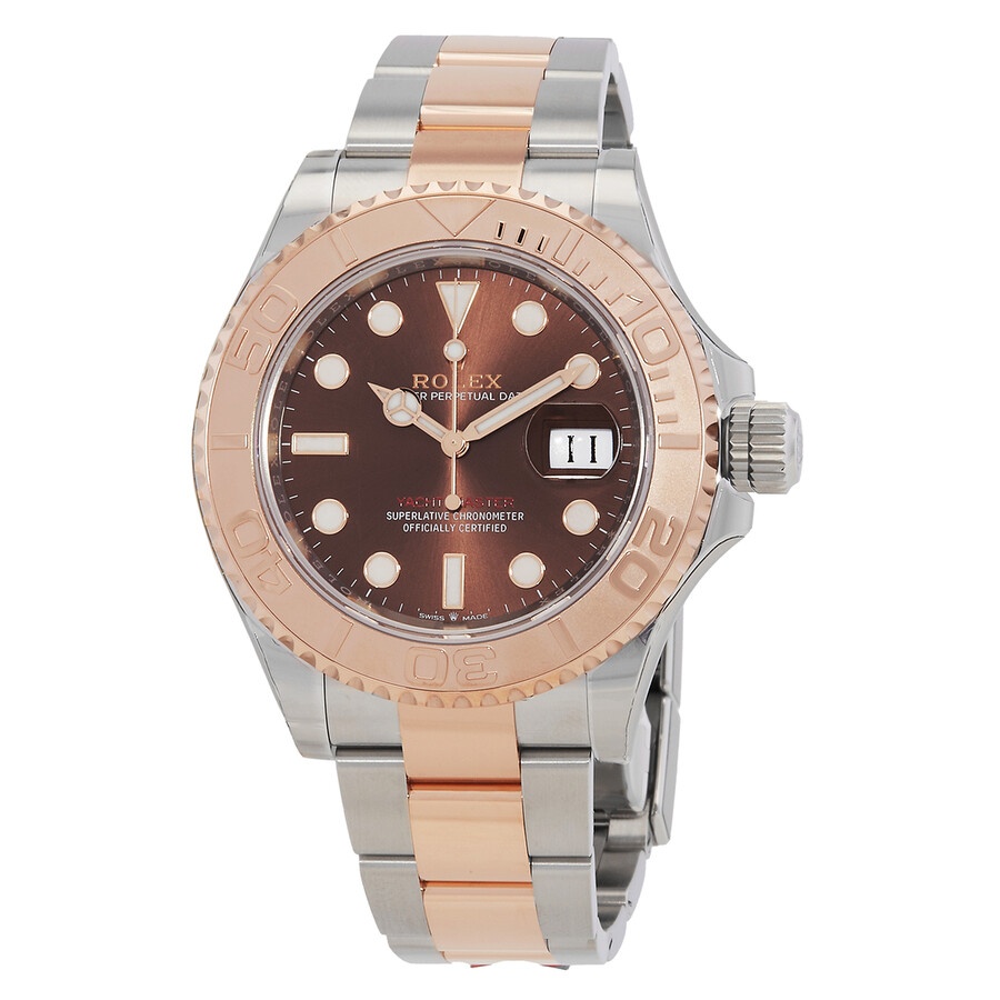 Silver-tone stainless steel case with a two-tone (silver-tone and rose gold-tone) stainless steel and 18 ct everose gold oyster bracelet. Bi-directional rotating 18 ct everose gold bezel. Chocolate dial with everose gold Mercedes-logo, sword, and Breguet-style shape hands and index hour markers. Minute markers around the outer rim. Dial Type: Analog. Luminescent hands and markers. Date display at the 3 o'clock position. Rolex Calibre 3235 automatic movement with a 70-hour power reserve. Scratch resistant sapphire crystal. Screw down crown. Solid case back. Round case shape. Case size: 40 mm. Oysterlock clasp. Water resistant at 100 meters / 330 feet. Functions: date, hour, minute, second. Luxury watch style. Watch label: Swiss Made. Rolex Yacht-Master 40 Chocolate Dial Automatic Men's Steel and 18 ct Everose Gold Oyster Watch 126621CHSO. INFORMATION Brand: Rolex Series: Yacht-Master Collection Name: Yacht-Master Gender: Mens Model: 126621CHSO Watch Label: Swiss Made Movement: Automatic Engine: Rolex Calibre 3235 Power Reserve: 70 hours CASE Case Size: 40 mm Case Color: Silver-Tone Case Material: Stainless Steel Case Shape: Round Case Back: Solid BAND Band Material: Stainless Steel and 18 ct Everose Gold Oyster Band Type: Bracelet Band Color: Two-tone (Silver-tone and Rose Gold-tone) Clasp: Oysterlock DIAL Dial Color: Chocolate Type: Analog Crystal: Scratch Resistant Sapphire Hands: Everose Gold Mercedes-logo, sword, and Breguet-style shape Dial Markers: Index Second Markers: Minute Markers around the outer rim Luminiscence: Hands and Markers Bezel: Bi-directional Rotating Bezel Material: 18 ct Everose Gold Crown: Screw Down FEATURES Water Resistance: 100 meters / 330 feet Calendar: Date display at the 3 o'clock position Functions: Date, Hour, Minute, Second Watch Features: Stainless Steel, Gold, Analog ADDITIONAL INFO Watch Style: Luxury Warranty: 2 Year Jomashop Warranty Additional Info: Original Box, Manual (Complete Accessories) Jomashop Sku: RLX126621CHSO Item Variation: m126621-0001 Department: Watches Category: Watches
