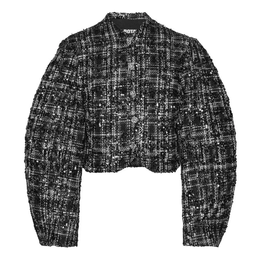 Rotate Ladies Outerwear. Fashion category: Coats & Jackets. SKU: 113908000-1000 BLACK COMB. Color: 1000 Black Comb. Rotate Boucle Sequin Cropped Jacket. This jacket showcases a cropped silhouette with voluminous long sleeves and a button-up front for a refined yet modern look. Made from textured boucle fabric, it is embellished with intricate sequin detailing and features decorative buttons and a subtly curved hemline. 100% Polyester. GENERAL Color: 1000 Black Comb. INFORMATION Brand: Rotate Gender: Womens Model: 113908000-1000 BLACK COMB. DETAILS Category: Outerwear Apparel Type: Coats & Jackets Material: Polyester ADDITIONAL INFO Jomashop Sku: -9080001000BLACKCOMB Department: Clothing