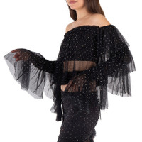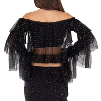 Rotate Ladies Tops. Fashion category: T-Shirts & Henleys. SKU: 111113100. Material: Polyester. Color: Black. Rotate Rhinestone-Embellished Ruffled Mesh Cropped Top. this top featurs long sleeves, an off shoulder fit, cropped line, ruffled details and all over dot motif. 100% Polyester. GENERAL Color: Black INFORMATION Brand: Rotate Gender: Womens Model: 111113100 DETAILS Category: Tops Apparel Type: T-Shirts & Henleys Material: Polyester ADDITIONAL INFO Jomashop Sku: -111113100BLACK Department: Clothing
