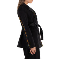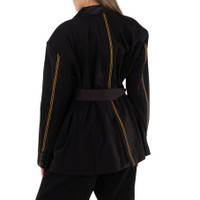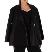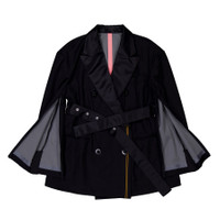 Sacai Ladies Outerwear. Fashion category: Coats & Jackets. SKU: 23-06520-001. Color: Black. Sacai Ladies Black Loro Piana Suiting Jacket. This jacket features a stylish black double-breasted coat with wide notched lapels, featuring a glossy satin finish on the lapels. The jacket has a semi belted waist, adding a structured element to its otherwise relaxed silhouette. It has multiple buttons on the front, and two large flap pockets. The interior of the jacket reveals a striking striped lining contarsting accents. GENERAL Size Info: Medium Apparel Size: Ladies Apparel Size: M Color: Black INFORMATION Brand: Sacai Gender: Womens Model: 23-06520-001 DETAILS Category: Outerwear Apparel Type: Coats & Jackets ADDITIONAL INFO Jomashop Sku: Z-9J48Y Department: Apparel