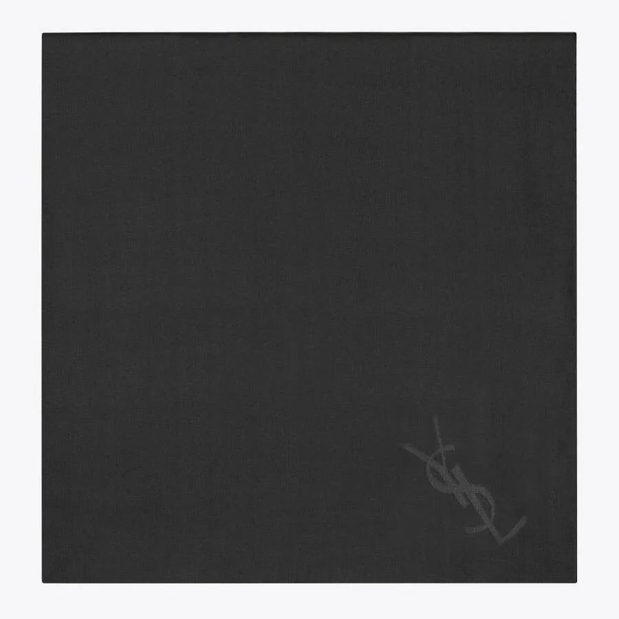 Saint Laurent Ladies Scarves. Fashion category: Scarves. SKU: 778715 3Y039 1000. Color: Black. Saint Laurent Black Silk Scarf. This Saint Laurent silk scarf embodies understated luxury and timeless elegance. Crafted from pure silk, it features a deep black hue with a subtle natural sheen that enhances its refined appeal. A discreet Saint Laurent logo detail in the corner adds a signature finishing touch without detracting from the minimalist design. Soft, fluid, and versatile, it can be styled effortlessly around the neck or layered with outerwear for a polished look. Material: 100% silk. GENERAL Ring Style: Fashion Gender: Womens Color: Black Apparel Type: Scarves INFORMATION Brand: Saint Laurent Model: 778715 3Y039 1000 ADDITIONAL INFO UPC Code: 3615093005732 Jomashop Sku: Z-AL2KR Department: Fashion Accessories Category: Scarves