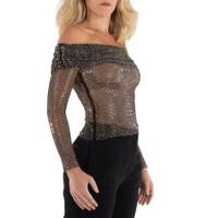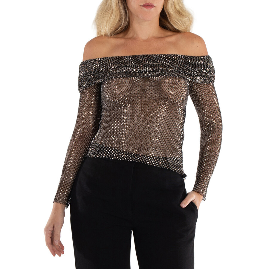 Self Portrait Ladies Tops. Fashion category: T-Shirts & Henleys. SKU: PF23-113T-B. Color: Black. Self Portrait Rhinestone Embellished Off-Shoulder Top. This top features a black stretch design with mesh detailing and a semi-sheer construction. It is embellished with rhinestones, has an off-shoulder style with a foldover top, long sleeves, and a straight hem. 94% Polyester, 6% Elastane, Lining: 95% Polyamide, 5% Elastane. Made in Italy. GENERAL Color: Black INFORMATION Brand: Self Portrait Gender: Womens Model: PF23-113T-B DETAILS Category: Tops Apparel Type: T-Shirts & Henleys ADDITIONAL INFO Jomashop Sku: -PF23113TBBLACK Department: Apparel