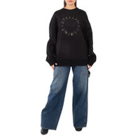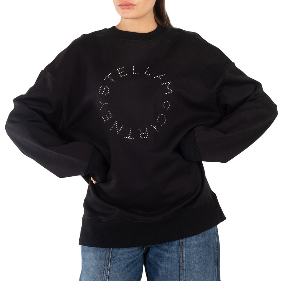 Stella McCartney Ladies Tops. Fashion category: Hoodies & Sweatshirts. SKU: 6J02063SPX371000. Color: Black. Stella McCartney Black Rhinestone Logo Sweatshirt. Made in Italy, this sweatshirt is crafted from cotton. It showcases a round neckline, dropped shoulders, long sleeves, elasticated ribbed profiles, a front logo adorned with contrasting rhinestones, and a straight hem. GENERAL Color: Black INFORMATION Brand: Stella Mccartney Gender: Womens Model: 6J02063SPX371000 DETAILS Category: Tops Apparel Type: Hoodies & Sweatshirts Material: Cotton ADDITIONAL INFO Jomashop Sku: -6J02063SPX371000 Department: Apparel