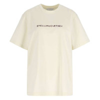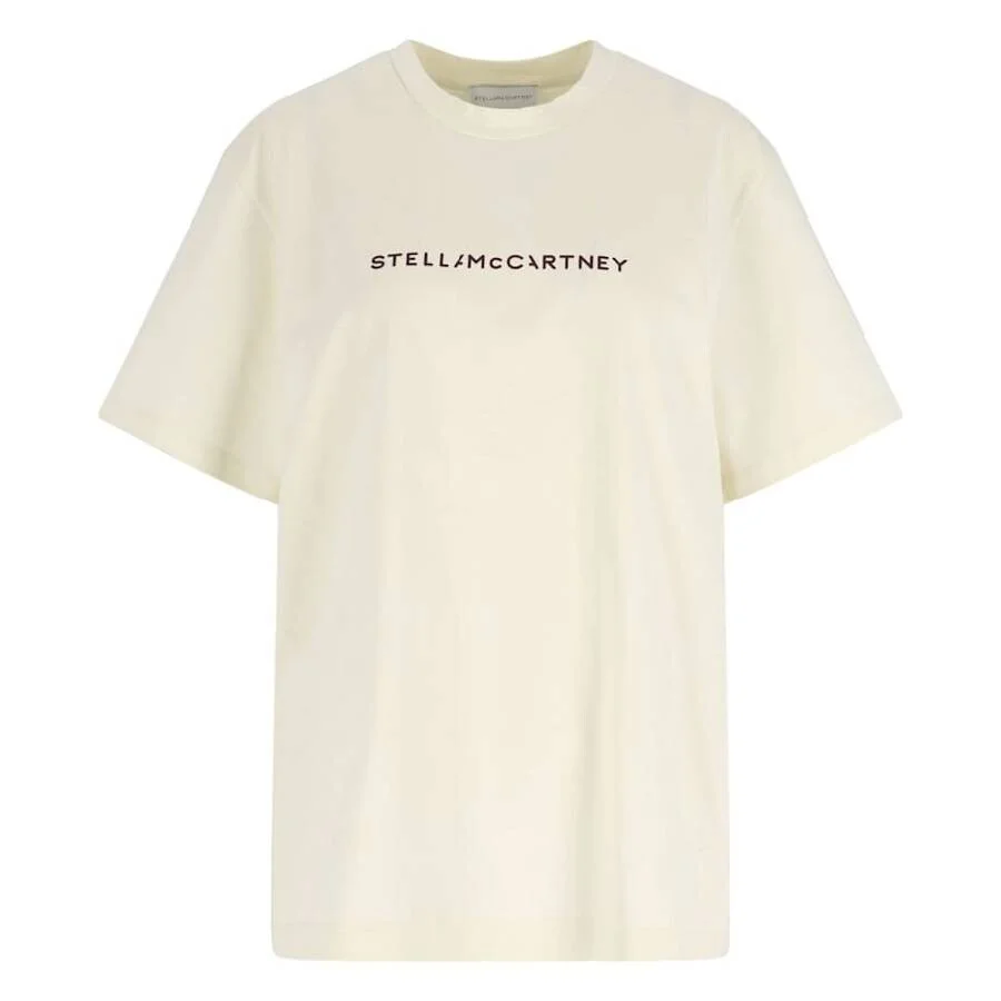 Stella Mccartney Ladies Tops. Fashion category: T-Shirts & Henleys. SKU: 6J01583SPY48-9002. Color: Ivory. Stella Mccartney Logo Oversized Cotton T-Shirt. This t-shirt is crafted from soft organic cotton jersey and features a classic crew neck and short sleeves. Designed with a relaxed fit, it has dropped shoulders for a modern silhouette, while the front is accented with bold black "Stella Mccartney" lettering. 100% organic cotton. Made in Portugal. GENERAL Brand Type: Designer Color: Ivory INFORMATION Brand: Stella McCartney Gender: Womens Model: 6J01583SPY48-9002 DETAILS Category: Tops Apparel Type: T-Shirts & Henleys Material: Cotton ADDITIONAL INFO Jomashop Sku: -6J01583SPY489002 Department: Clothing