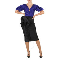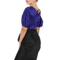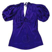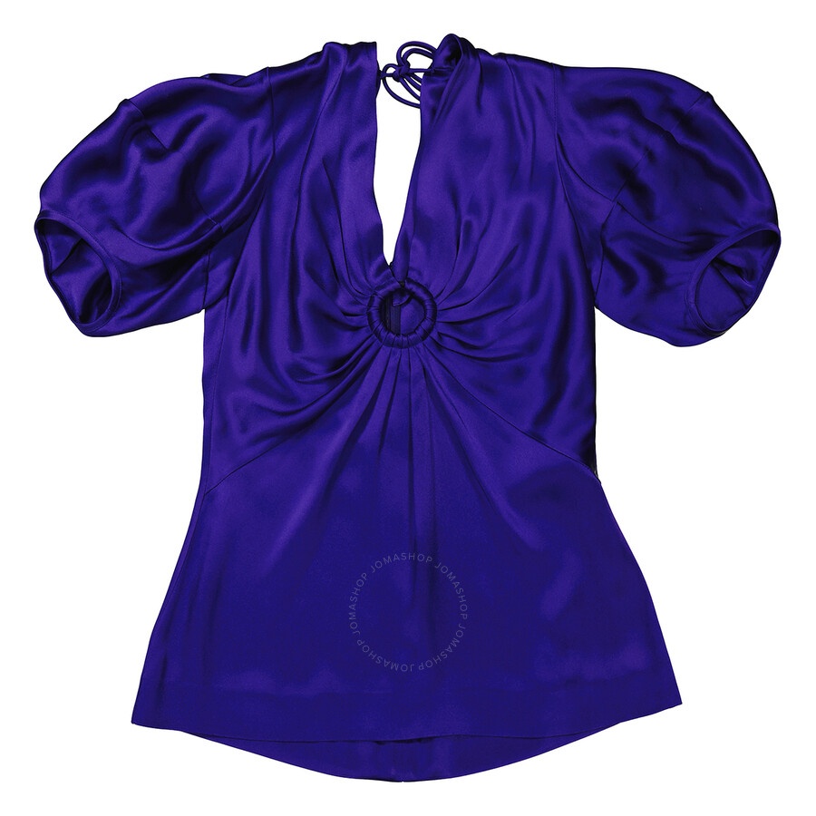 Stella Mccartney Ladies Tops. Fashion category: Shirts & Blouses. SKU: 6T0043 3AU309-4200. Color: Sapphire Blue. Stella Mccartney Sapphire Blue Puff-Sleeve Ruched Blouse. This blouse features a deep V-neckline at the front and back. The front is adorned with a central eye-catching ring, adding a touch of glamour to the piece, while the back is finished with long ties and an invisible zip and hook-and-eye closure. 64% Acetate, 36% Viscose. GENERAL Color: Sapphire Blue INFORMATION Brand: Stella Mccartney Gender: Womens Model: 6T0043 3AU309-4200 DETAILS Category: Tops Apparel Type: Shirts & Blouses Material: Acetate, Viscose ADDITIONAL INFO Jomashop Sku: -6T00433AU3094200 Department: Apparel