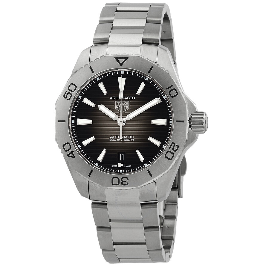 Stainless steel case with a stainless steel bracelet. Uni-directional rotating stainless steel bezel. Black dial with luminous silver-tone hands. Minute markers around the outer rim. Dial Type: Analog. Luminescent hands and markers. Date display at the 6 o'clock position. Automatic movement. Scratch resistant sapphire crystal. Screw down crown. Solid case back. Dodecagon case shape. Case size: 40 mm. Fold over clasp with a safety release. Water resistant at 200 meters / 660 feet. Functions: date, hour, minute, second. Aquaracer Series. Dress watch style. Tag Heuer Aquaracer Automatic Black Dial Men's Watch WBP2110.BA0627. INFORMATION Brand: Tag Heuer Series: Aquaracer Collection Name: Aquaracer Gender: Mens Model: WBP2110.BA0627 Movement: Automatic CASE Case Size: 40 mm Case Material: Stainless Steel Case Shape: Dodecagon Case Back: Solid BAND Band Material: Stainless Steel Band Type: Bracelet Band Color: Silver-tone Clasp: Fold Over with Safety Release DIAL Dial Color: Black Type: Analog Crystal: Scratch Resistant Sapphire Hands: Luminous Silver-tone Second Markers: Minute Markers around the outer rim Luminiscence: Hands and Markers Bezel: Uni-directional Rotating Bezel Color: Silver-tone Bezel Material: Stainless Steel Crown: Screw Down FEATURES Water Resistance: 200 meters / 660 feet Calendar: Date display at the 6 o'clock position Functions: Date, Hour, Minute, Second Watch Features: Stainless Steel, Analog ADDITIONAL INFO Watch Style: Dress Warranty: 2 Year Jomashop Warranty UPC Code: 7612533162570 Jomashop Sku: THWBP2110BA0627 Department: Watches Category: Watches