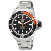 Grey titanium case and bracelet. Black ceramic bezel. Black dial with silver-tone hands and index hour markers. Minute markers around the outer rim. Dial Type: Analog. Luminescent hands and markers. Date display at the 6 o'clock position. Automatic movement. Scratch resistant sapphire crystal. Screw down crown. Solid case back. Round case shape, case size: 45 mm. Fold over clasp with a safety release. Water resistant at 1000 meters / 3300 feet. Functions: date, hour, minute, second. Additional Info: original box, international warranty card, manual (complete accessories). Aquaracer Series. Dive watch style. Watch label: Swiss Made. Tag Heuer Aquaracer Automatic Black Dial Men's Watch WBP5A8A.BF0619. INFORMATION Brand: Tag Heuer Series: Aquaracer Collection Name: Aquaracer Gender: Mens Model: WBP5A8A.BF0619 Watch Label: Swiss Made Movement: Automatic CASE Case Size: 45 mm Case Material: Titanium Case Shape: Round Case Back: Solid BAND Band Material: Titanium Band Type: Bracelet Band Color: Grey Clasp: Fold Over with Safety Release DIAL Dial Color: Black Type: Analog Crystal: Scratch Resistant Sapphire Hands: Silver-tone Dial Markers: Index Second Markers: Minute Markers around the outer rim Luminiscence: Hands and Markers Bezel Color: Black Bezel Material: Ceramic Crown: Screw Down FEATURES Water Resistance: 1000 meters / 3300 feet Calendar: Date display at the 6 o'clock position Functions: Date, Hour, Minute, Second Watch Features: Titanium, Ceramic, Analog ADDITIONAL INFO Watch Style: Dive Warranty: 2 Year Jomashop Warranty UPC Code: 7612533164741 Additional Info: Original Box, International Warranty Card, Manual (Complete Accessories) Jomashop Sku: THWBP5A8ABF0619 Department: Watches Category: Watches