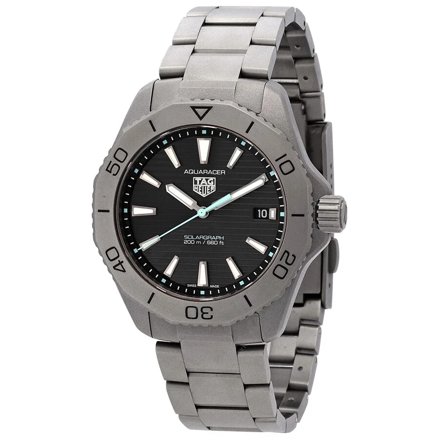 Grey titanium case and bracelet. Grey titanium bezel. Black dial with black hands and index hour markers. Minute markers around the outer rim. Dial Type: Analog. Luminescent hands and markers. Date display at the 3 o'clock position. Tag Heuer Calibre Th50 00 quartz movement. Scratch resistant sapphire crystal. Solid case back. Round case shape, case size: 40 mm. Deployment with push button release clasp. Water resistant at 200 meters / 660 feet. Functions: date, hour, minute, second. Additional Info: original box, international warranty card, manual (complete accessories). Aquaracer Series. Luxury watch style. Watch label: Swiss Made. Tag Heuer Aquaracer Quartz Black Dial Men's Watch WBP1180.BF0000. INFORMATION Brand: Tag Heuer Series: Aquaracer Collection Name: Aquaracer Gender: Mens Model: WBP1180.BF0000 Watch Label: Swiss Made Movement: Quartz Engine: Tag Heuer Calibre Th50 00 CASE Case Size: 40 mm Case Material: Titanium Case Shape: Round Case Back: Solid BAND Band Material: Titanium Band Type: Bracelet Band Color: Grey Clasp: Deployment with Push Button Release DIAL Dial Color: Black Type: Analog Crystal: Scratch Resistant Sapphire Hands: Black Dial Markers: Index Second Markers: Minute Markers around the outer rim Luminiscence: Hands and Markers Bezel Color: Grey Bezel Material: Titanium FEATURES Water Resistance: 200 meters / 660 feet Calendar: Date display at the 3 o'clock position Functions: Date, Hour, Minute, Second Watch Features: Titanium, Analog ADDITIONAL INFO Watch Style: Luxury Warranty: 2 Year Jomashop Warranty Additional Info: Original Box, International Warranty Card, Manual (Complete Accessories) Jomashop Sku: THWBP1180BF0000 Department: Watches Category: Watches