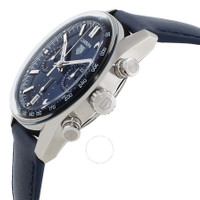 Silver-tone stainless steel case with a blue leather strap. Fixed silver-tone stainless steel bezel. Blue dial with silver-tone hands and index hour markers. Minute markers around the outer rim. Dial Type: Analog. Luminescent hands and markers. Date display at the 6 o'clock position. Chronograph - three sub-dials displaying: 60 second, 30 minute and 12 hour. Tag Heuer Calibre TH20-00 automatic movement. Scratch resistant sapphire crystal. Transparent see through case back. Round case shape, case size: 39 mm. Deployment with push button release clasp. Water resistant at 100 meters / 330 feet. Functions: chronograph, date, hour, minute, second. Additional Info: original box, international warranty card, manual (complete accessories). Carrera Series. Luxury watch style. Watch label: Swiss Made. Tag Heuer Carrera Chronograph Automatic Blue Dial Men's Watch CBS2212.FC6535. INFORMATION Brand: Tag Heuer Series: Carrera Collection Name: Carrera Gender: Mens Model: CBS2212.FC6535 Watch Label: Swiss Made Movement: Automatic Engine: Tag Heuer Calibre TH20-00 CASE Case Size: 39 mm Case Material: Stainless Steel Case Shape: Round Case Back: Transparent See Through BAND Band Material: Leather Band Type: Strap Band Color: Blue Clasp: Deployment with Push Button Release DIAL Dial Color: Blue Type: Analog Crystal: Scratch Resistant Sapphire Hands: Silver-tone Dial Markers: Index Second Markers: Minute Markers around the outer rim Sub Dials: Three - 60 Second, 30 Minute and 12 Hour Luminiscence: Hands and Markers Bezel: Fixed Bezel Color: Silver-tone Bezel Material: Stainless Steel FEATURES Water Resistance: 100 meters / 330 feet Calendar: Date display at the 6 o'clock position Functions: Chronograph, Date, Hour, Minute, Second Watch Features: Chronograph, Stainless Steel, Leather, Analog ADDITIONAL INFO Watch Style: Luxury Warranty: 2 Year Jomashop Warranty Additional Info: Original Box, International Warranty Card, Manual (Complete Accessories) Jomashop Sku: THCBS2212FC6535 Department: Watches Category: Watches
