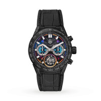 Black titanium carbon PVD case with a black rubber;alligator strap. Fixed black carbon bezel. Black opalin dial with silver-tone hands and index hour markers. Tachymeter scale around the outer rim. Dial Type: Analog. Luminescent hands and markers. Chronograph - sub-dials displaying: 1/4 second, 30 minutes counter, 12 hours counter, tourbillon 1 minute. Calibre Heuer 02T 45 automatic movement with a 65-hour power reserve. Scratch resistant sapphire crystal. Transparent see through case back. Round case shape, case size: 45 mm. Fold over clasp with a safety release. Water resistant at 100 meters / 330 feet. Functions: chronograph, hour, minute, second. Additional Info: limited to 150 pieces. Carrera Polychrome Series. Luxury watch style. Watch label: Swiss Made. Tag Heuer Carrera Polychrome Chronograph Tourbillon Men's Watch CAR5A8AF.FC6415. CASE Case Size: 45 Case Material: Titanium Carbon PVD Case Shape: Round Case Back: Transparent See Through BAND Band Material: Rubber;Alligator Band Type: Strap Band Color: Black Clasp: Fold Over with Safety Release DIAL Dial Color: Black Opalin Type: Analog Crystal: Scratch Resistant Sapphire Hands: Silver-tone Dial Markers: Index Second Markers: Tachymeter Scale around the outer rim Sub Dials: 1/4 second, 30 minutes counter, 12 hours counter, Tourbillon 1 minute Luminiscence: Hands and Markers Bezel: Fixed Bezel Color: Black Bezel Material: Carbon INFORMATION Brand: Tag Heuer Series: Carrera Polychrome Collection Name: Carrera Polychrome Gender: Mens Model: CAR5A8AF.FC6415 Watch Label: Swiss Made Movement: Automatic Engine: Calibre Heuer 02T 45 Power Reserve: 65 hours FEATURES Water Resistance: 100 meters / 330 feet Functions: Chronograph, Hour, Minute, Second Watch Features: Alligator Leather, Analog, Rubber, Titanium, Chronograph, Tourbillon ADDITIONAL INFO Watch Style: Luxury Warranty: 2 Year Jomashop Warranty UPC Code: 7612533167476 Additional Info: Limited to 150 pieces Jomashop Sku: THCAR5A8AFFC6415 Department: Watches Category: Watches