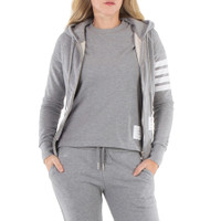 Thom Browne Ladies Tops. Fashion category: Hoodies & Sweatshirts. SKU: FJT001A 00535 055. Color: Lt Grey. Thom Browne Grey 4-Bar Loopback Full Zip Hoodie. This 100% cotton hoodie features long sleeves with a silver-tone 2-way zip closure, an integrated hood adorned with stripe trim, a 4-bar stripe detail on the left sleeve, and a kangaroo front pocket complemented by a name tag applique. GENERAL Color: Lt Grey INFORMATION Brand: Thom Browne Gender: Womens Model: FJT001A 00535 055 DETAILS Category: Tops Apparel Type: Hoodies & Sweatshirts ADDITIONAL INFO Jomashop Sku: -FJT001A00535055 Department: Apparel