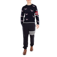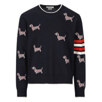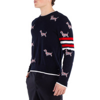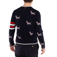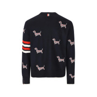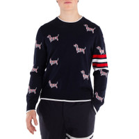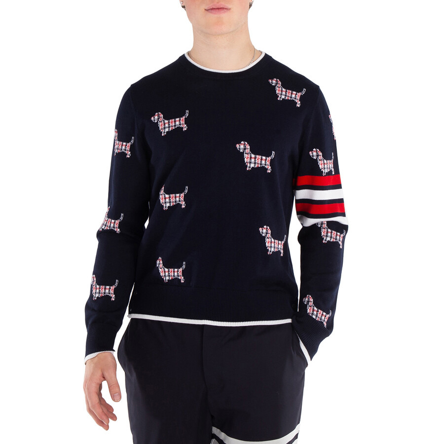 Thom Browne Men's Tops. Fashion category: Cardigans & Sweaters. SKU: MKA490B Y1002 415. This roomy pullover showcases Thom Browne's mastery of innovative design and tailored excellence. Inspired by his beloved dachshund, Hector, the piece features iconic 4-Bar detailing. Buttoned cuffs and side vents, both accented with signature striped grosgrain trim, add a refined touch, while the signature striped grosgrain loop tab completes the look. 99% Virgin Wool, 1% Polyamide. Made in Italy. GENERAL Color: Navy INFORMATION Brand: Thom Browne Gender: Mens Model: MKA490B Y1002 415 DETAILS Category: Tops Apparel Type: Cardigans & Sweaters Material: Polyamide, Wool ADDITIONAL INFO Jomashop Sku: -MKA490BY1002415 Department: Clothing