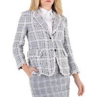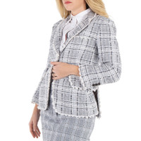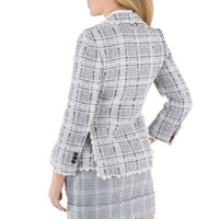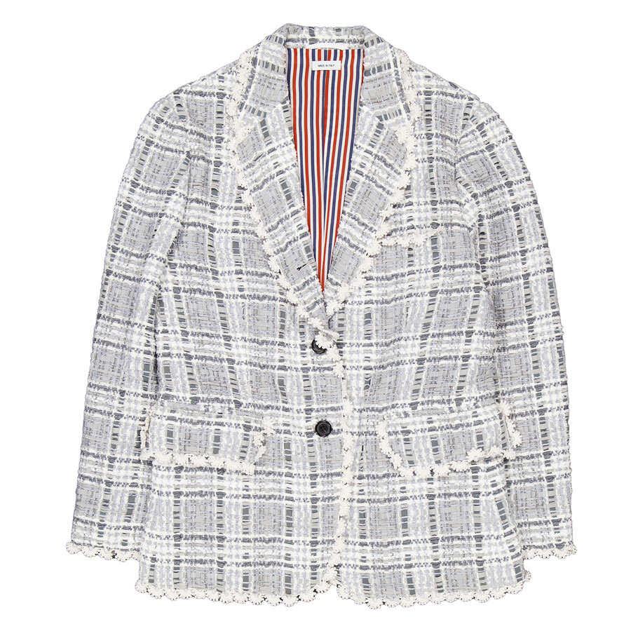 Thom Browne Ladies Outerwear. Fashion category: Coats & Jackets. SKU: FBC700E E0610 035. Color: Med Grey. Thom Browne Ladies Med Grey Prince Of Wales Chenille Tweed Wave Classic Sport Coat. This classic sport coat is crafted from checked chenille tweed with wavy pearl lace tipping trim. It features a 3-button front closure, notched lapels, two front flap pockets, a single chest pocket, and buttoned cuffs with signature striped grosgrain trim. The design also includes a double-vented back hem and a signature striped grosgrain loop tab at the back of the neck. Made in Italy. GENERAL Color: Med Grey INFORMATION Brand: Thom Browne Gender: Womens Model: FBC700E E0610 035 DETAILS Category: Outerwear Apparel Type: Coats & Jackets ADDITIONAL INFO Jomashop Sku: -FBC700EE0610035 Department: Apparel