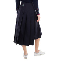 Thom Browne Ladies Bottoms. Fashion category: Skirts. SKU: FGC400V 00626 415. Color: Navy. Thom Browne Ladies Navy Twill Pleated Midi Skirt. A twill wool skirt features an adjustable Buttoned side tab closure, a dropped back with signature striped grosgrain trim, a Signature striped grosgrain loop tab at back waist, an asymmetrical hem and pleated details. 100% Wool. Made in Italy. GENERAL Color: Navy INFORMATION Brand: Thom Browne Gender: Womens Model: FGC400V 00626 415 DETAILS Category: Bottoms Apparel Type: Skirts Material: Wool ADDITIONAL INFO Jomashop Sku: -FGC400V00626415 Department: Clothing