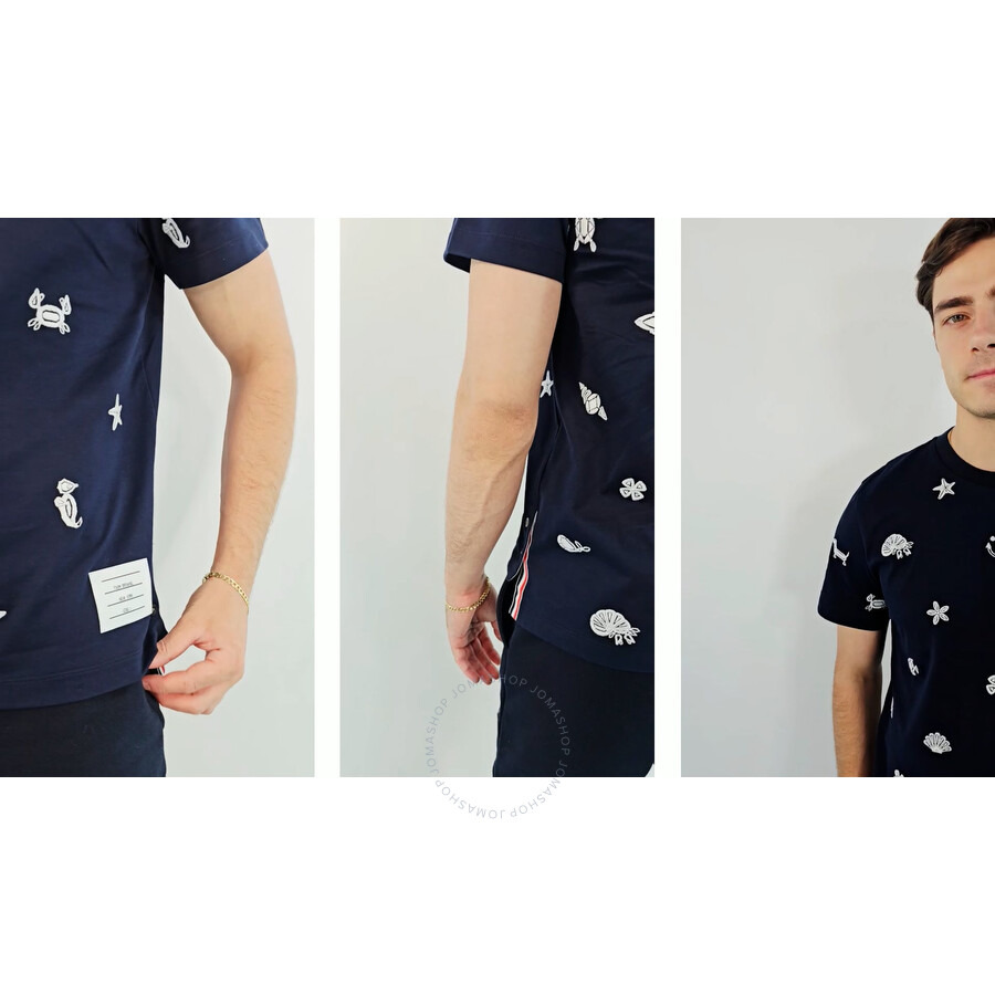 Thom Browne Men's Tops. Fashion category: T-Shirts & Henleys. SKU: MJS254E 00042 415. Thom Browne Men's Jersey Nautical Short Sleeve Tee. This cotton tee features a name tag applique, buttoned side vents with striped grosgrain trim, and a signature striped grosgrain loop tab. It is adorned with nautical symbolism throughout. 100% Cotton. INFORMATION Brand: Thom Browne Gender: Mens Model: MJS254E 00042 415 DETAILS Category: Tops Apparel Type: T-Shirts & Henleys Material: Cotton ADDITIONAL INFO Jomashop Sku: -MJS254E00042415 Department: Clothing