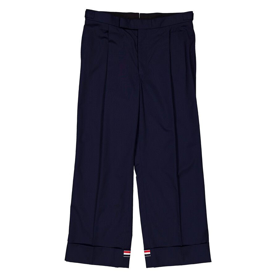 Thom Browne Men's Bottoms. Fashion category: Pants & Leggings. SKU: MTC162E 04502 415. Thom Browne Men's RWB-Stripe Tailored Trousers. These tailored trousers feature an RWB stripe, a mid-rise fit, and a concealed front fastening. They have a straight leg, slip pockets on the sides, turn-up cuffs, and a cropped leg. Polyester 65%, Cotton 35% INFORMATION Brand: Thom Browne Gender: Mens Model: MTC162E 04502 415 DETAILS Category: Bottoms Apparel Type: Pants & Leggings Material: Cotton, Polyester ADDITIONAL INFO Jomashop Sku: -MTC162E04502415 Department: Clothing