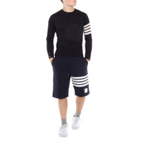 Thom Browne Men's Bottoms. Fashion category: Shorts. SKU: MJQ012H 00535 461. Color: Navy. Thom Browne Navy 4-Bar Loopback Cotton Sweatshorts. Crafted from 100% cotton, Thom Browne sweat shorts feature a drawstring waistband with silver-tone aglets. The left thigh showcases the engineered 4-bar stripe detail, while a name tag applique adorns the area above the left cuff. These shorts come with slip side pockets, a single back welt pocket, and the signature striped grosgrain loop tab at the back waist. GENERAL Color: Navy INFORMATION Brand: Thom Browne Gender: Mens Model: MJQ012H 00535 461 DETAILS Category: Bottoms Apparel Type: Shorts Material: Cotton ADDITIONAL INFO Jomashop Sku: -MJQ012H00535461 Department: Apparel