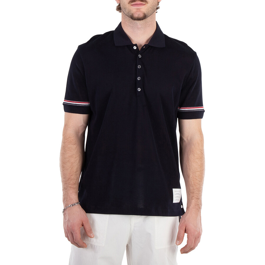 Thom Browne Men's Tops. Fashion category: Polo Shirts. SKU: MJP193A J0129 415. Color: Navy. Thom Browne Short Sleeve Cotton Polo Shirt. This cotton polo shirt features a spread collar, a partial front button placket, buttoned side vents with grosgrain trim, a name tag applique above the hem, and a signature striped grosgrain loop tab. 100% Cotton. Made in Italy. INFORMATION Brand: Thom Browne Gender: Mens Model: MJP193A J0129 415 DETAILS Category: Tops Apparel Type: Polo Shirts Material: Cotton ADDITIONAL INFO Jomashop Sku: -MJP193AJ0129415 Department: Clothing