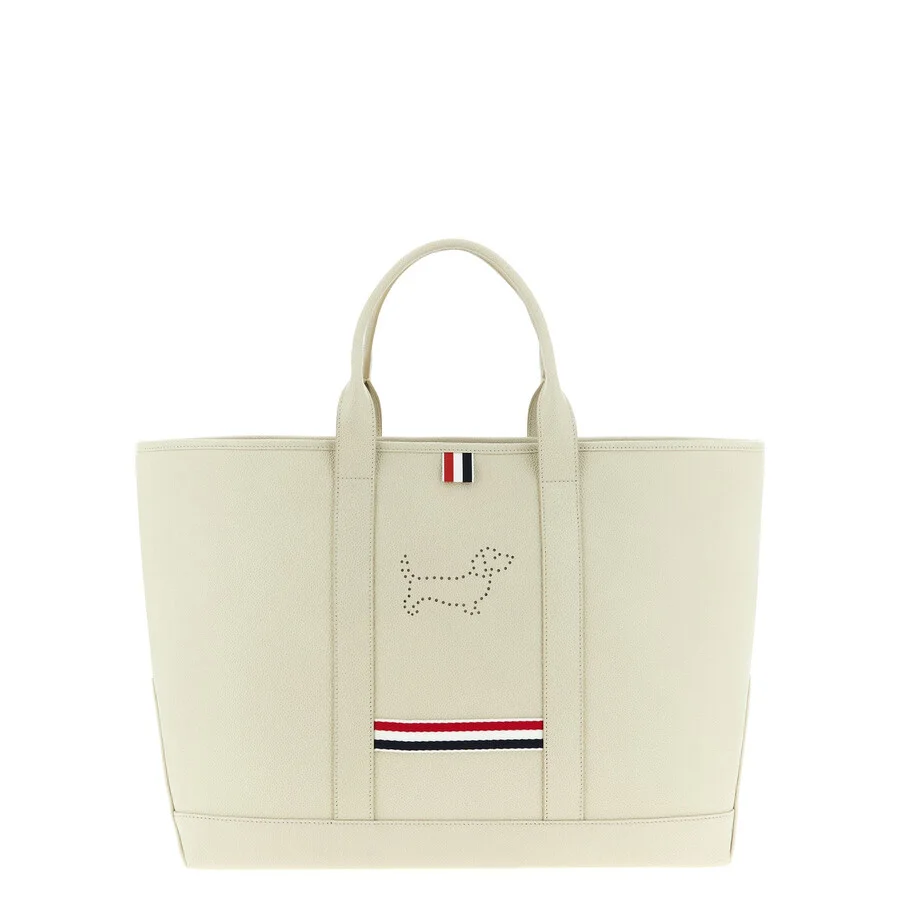 Thom Browne Ladies Tote. SKU: UAG259A00198250. Color: White. Size: W 50 x H 16 x W 11 cm. Thom Browne Tool Tote Shopping Bag. 'Tool Tote' pebble grain leather shooping with double fixed handle, front 'Perforated Hector' and RWB detail,Composition: 100% calfskin leather (Bos Taurus) GENERAL Size Info: W 50 x H 16 x W 11 cm Color: White INFORMATION Brand: Thom Browne Gender: Womens Model: UAG259A00198250 ADDITIONAL INFO UPC Code: 197963964491 Jomashop Sku: Z-ZGC9V Department: Bags Category: Tote Bags