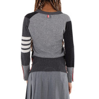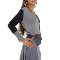 Thom Browne Ladies Tops. Fashion category: Cardigans & Sweaters. SKU: FKC001F 00011 982. Color: Tonal Grey. Thom Browne V-Neck Cashmere Funmix Cardigan. The cardigan features a V-neckline, front button closure with a striped grosgrain placket, 4-bar stripe detail on the left sleeve, buttoned side vents and cuffs with striped grosgrain trim, and a signature striped grosgrain loop tab at the back of the neck. 100% Cashmere. Made in United Kingdom. GENERAL Color: Tonal Grey INFORMATION Brand: Thom Browne Gender: Womens Model: FKC001F 00011 982 DETAILS Category: Tops Apparel Type: Cardigans & Sweaters Material: Cashmere ADDITIONAL INFO Jomashop Sku: -FKC001F00011982 Department: Clothing