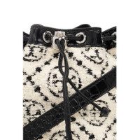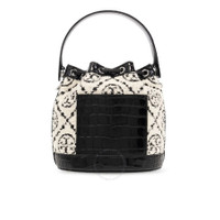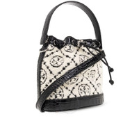 Tory Burch Ladies Bucket Bag. SKU: 152385-001. Color: Black. Size: H: 8.3" x L: 8.3" x D: 4.7". Tory Burch Boucle Monogram Drawstring Bucket Bag. This bucket bag features a microfiber lining with a suede-like finish, a drawstring closure, and a top handle with a 6.1" (15.5cm) drop. It also includes an adjustable, removable crossbody strap with a 21.7" (55cm) drop, one exterior back slit pocket, one interior pocket, and a croc-embossed leather base with protective metal feet. Material: Boucle monogram and croc embossed leather; napa leather trim. GENERAL Size Info: H: 8.3" x L: 8.3" x D: 4.7" Color: Black INFORMATION Brand: Tory Burch Gender: Womens Model: 152385-001 DETAILS Material: Leather, Nappa Leather ADDITIONAL INFO UPC Code: 196133825945 Jomashop Sku: Z-HEEPM Department: Bags Category: Bucket Bag
