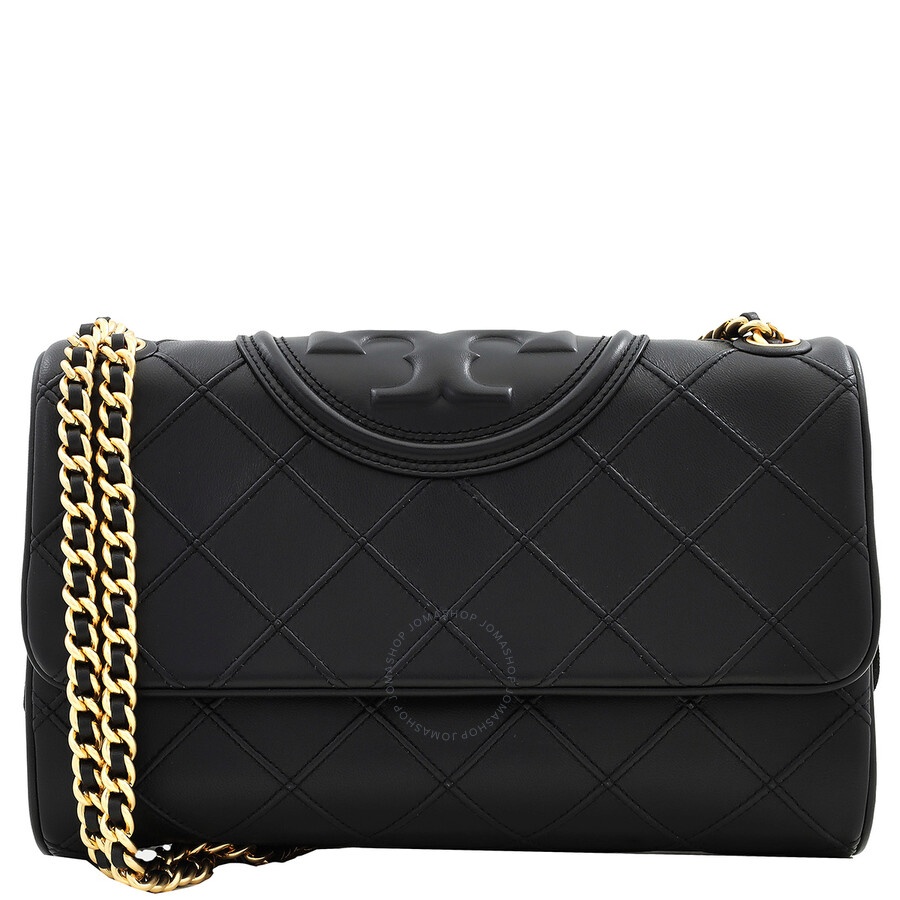 Tory Burch Ladies Shoulder Bag. SKU: 137301-001. Size: W 10.6" x H 7.3" x D 3.9". Tory Burch Fleming Quilted Leather Shoulder Bag. Diamond-shaped quilting and Tory Burch's Double T logo embossed to the front. Featuring gold-tone hardware, quilted finish, logo patch to the front, foldover top with magnetic fastening, partitioned compartment, internal zip-fastening pocket, internal logo patch and a chain-link shoulder strap GENERAL Size Info: W 10.6" x H 7.3" x D 3.9" Color: Black INFORMATION Brand: Tory Burch Gender: Womens Model: 137301-001 DETAILS Material: Leather Occasion: Casual Closure: Magnetic Snap DIMENSIONS Size: Small ADDITIONAL INFO UPC Code: 196133359075 Jomashop Sku: Z-E9BFD Department: Bags Category: Shoulder Bag