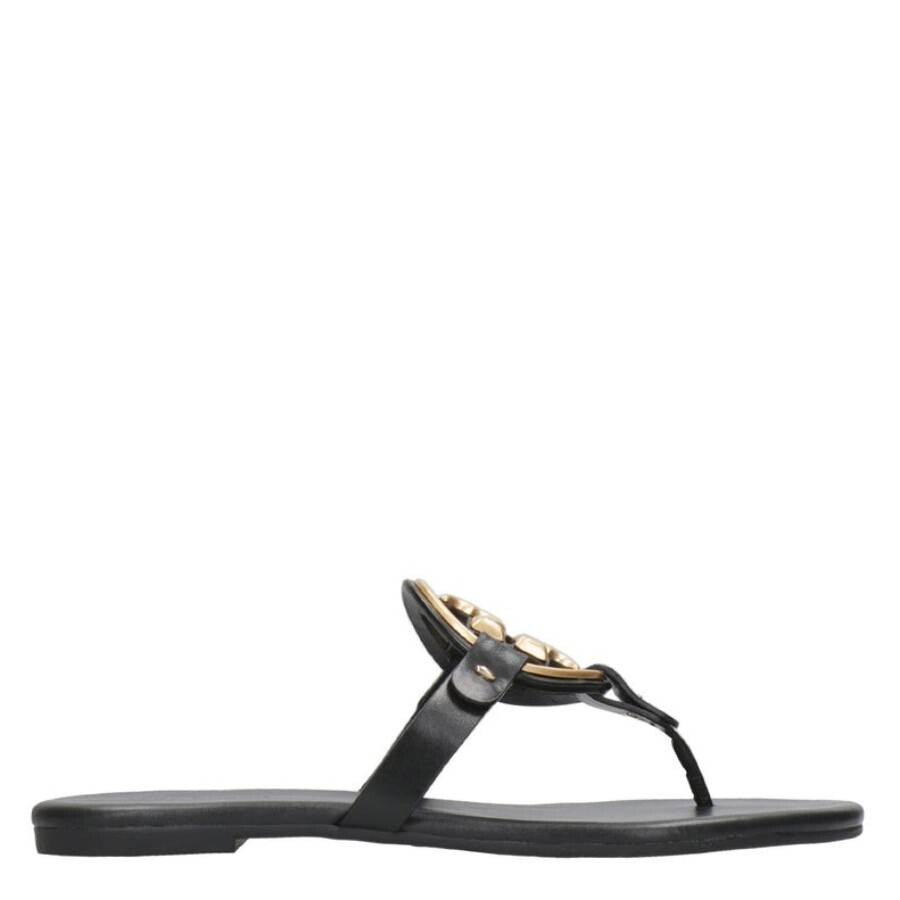 Tory Burch Ladies Sandals. SKU: 136593-006. Color: Perfect Black. Tory Burch Miller Soft Metal Logo Sandals. This iconic sandal now features an ultra-soft memory foam sole for lasting comfort and support. With a refined silhouette and an extra-padded footbed, it offers a minimalist design with clean lines and a seamless insole. The original laser-cut logo, with hand-painted edges, is topped with a metal overlay for added elegance. Expertly crafted from supple, full-grain leather, this sandal retains its beautiful finish over time. 100% Leather. Please visit the brand website for sizing information. GENERAL Brand Type: Designer INFORMATION Brand: Tory Burch Model: 136593-006 Gender: Womens DETAILS Category: Sandals Shoe Style: Slip-On Shoe Style: Slip-On Color: Perfect Black Shoe Vamp Style: Metal Hardware Upper Material: Leather Sole Material: Leather ADDITIONAL INFO Jomashop Sku: -136593006N Department: Shoes