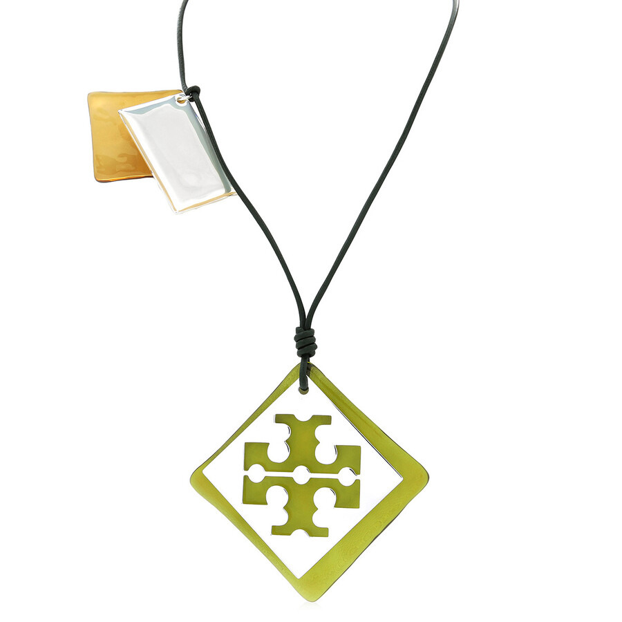 Tory Burch Ladies Necklaces. SKU: 157942-300. Color: Light Silver /Dark Green/Multi. Tory Burch Resin Logo Long Necklace. Suspended from a sleek black cord, the pendant showcases a square frame in a glossy olive-green finish, intricately cut with a symmetrical motif for an eye-catching touch. Accented with metallic rectangular charms in gold and silver tones, this piece blends contemporary style with artistic flair. GENERAL Brand Type: Designer Color: Light Silver /Dark Green/Multi INFORMATION Brand: Tory Burch Gender: Womens Model: 157942-300 DETAILS Ring Style: Fashion ADDITIONAL INFO UPC Code: 197865067177 Jomashop Sku: Z-8FK3Y Department: Jewelry Category: Necklaces