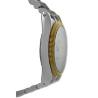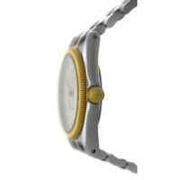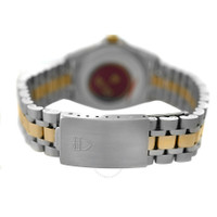 Silver-tone stainless steel case with a two-tone (silver-tone and yellow gold-tone) 18kt yellow gold and stainless steel bracelet. Fixed yellow gold-tone 18kt yellow gold bezel. White dial with yellow gold-tone hands and Arabic numeral hour markers. Minute markers around the outer rim. Dial Type: Analog. Date display at the 3 o'clock position. Quartz movement. Solid case back. Round case shape, case size: 34 mm. Band length: 7.25 inches. Fold over clasp with a safety release. Functions: date, hour, minute, second. Monarch Series. Casual watch style. Watch label: Swiss Made. Pre-owned Tudor Monarch Quartz White Dial Men's Watch 15733. GENERAL Collection Name: Monarch INFORMATION Brand: Tudor Series: Monarch Model: 15733 Gender: Mens Watch Label: Swiss Made Movement: Quartz CONDITION INFORMATION Box: No Preowned Item Condition: Unworn / Like New Papers: No Comments: The new store display model. The watch may have some micro scratches due to the storage. Fits the men's wrist up to 7.25 inches. A new battery was installed and quartz movement keeps perfect time. The serial and model numbers are presented and visible on the back case. Authenticity is 100% guaranteed. CASE Case Size: 34 Case Material: Stainless Steel Case Shape: Round Case Back: Solid DIAL Type: Analog Dial Color: White Hands: Yellow Gold-tone Second Markers: Minute Markers around the outer rim Dial Markers: Arabic Numeral Bezel: Fixed Bezel Color: Yellow Gold-tone Bezel Material: 18kt Yellow Gold BAND Band Type: Bracelet Band Material: 18kt Yellow Gold and Stainless Steel Band Color: Two-tone (Silver-tone and Yellow Gold-tone) Band Length: 7.25 inches Clasp: Fold Over with Safety Release FEATURES Calendar: Date display at the 3 o'clock position Functions: Date, Hour, Minute, Second Watch Features: Stainless Steel, Gold, Analog ADDITIONAL INFO Watch Style: Casual Warranty: 1 Year Jomashop Warranty Jomashop Sku: PRE-P-TUD74061 Department: Watches Category: Watches