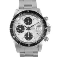 Silver-tone stainless steel case and bracelet. Black stainless steel bezel. Silver-tone dial with black hands and index hour markers. Minute markers around the outer rim. Dial Type: Analog. Luminescent hands and markers. Date display at the 3 o'clock position. Chronograph - three sub-dials displaying: 60 second, 30 minute and 12 hour. Automatic movement. Solid case back. Round case shape, case size: 40 mm. Fold over clasp with a safety release. Functions: chronograph, date, hour, minute, second. Oysterdate Big Block Series. Luxury watch style. Watch label: Swiss Made. Pre-owned Tudor Oysterdate Big Block Chronograph Automatic Silver Dial Men's Watch 79170. GENERAL Year: Circa 1995 Comments: This Tudor Oysterdate Big Block, reference number 79170, has a manufacturer year of Circa 1995. Box Included, Papers Included . This watch has a 40mm Steel Case with Steel bezel, Silver Index numerals dial and Steel bracelet with Fold clasp. The Automatic movement has Chronograph function. The wrist measures 7.85 inches or 19.939 centimeters. The condition is Very Good The watch listed is in stock and the pictures shown are of the actual watch for sale. All of our watches have been thoroughly c Preowned Item Condition: Very Good CASE Case Material: Stainless Steel Case Shape: Round Case Back: Solid BAND Band Material: Stainless Steel Band Type: Bracelet Band Color: Silver-tone Clasp: Fold Over with Safety Release DIAL Dial Color: Silver-tone Type: Analog Hands: Black Dial Markers: Index Second Markers: Minute Markers around the outer rim Sub Dials: Three - 60 Second, 30 Minute and 12 Hour Luminiscence: Hands and Markers Bezel Color: Black Bezel Material: Stainless Steel INFORMATION Brand: Tudor Series: Oysterdate Big Block Collection Name: Oysterdate Big Block Gender: Mens Model: 79170 Watch Label: Swiss Made Movement: Automatic FEATURES Calendar: Date display at the 3 o'clock position Functions: Chronograph, Date, Hour, Minute, Second Watch Features: Analog, Stainless Steel, Chronograph ADDITIONAL INFO Watch Style: Luxury Warranty: 1 Year Jomashop Warranty Jomashop Sku: PRE-P-TUD104490 Department: Watches Category: Watches